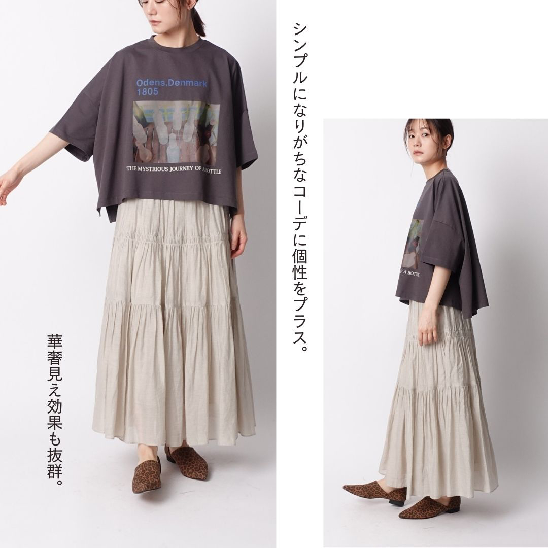 ティアードスカートは、生地感が柔らかく落ち感があるため、腰周りをカバーしつつ縦ラインを強調。