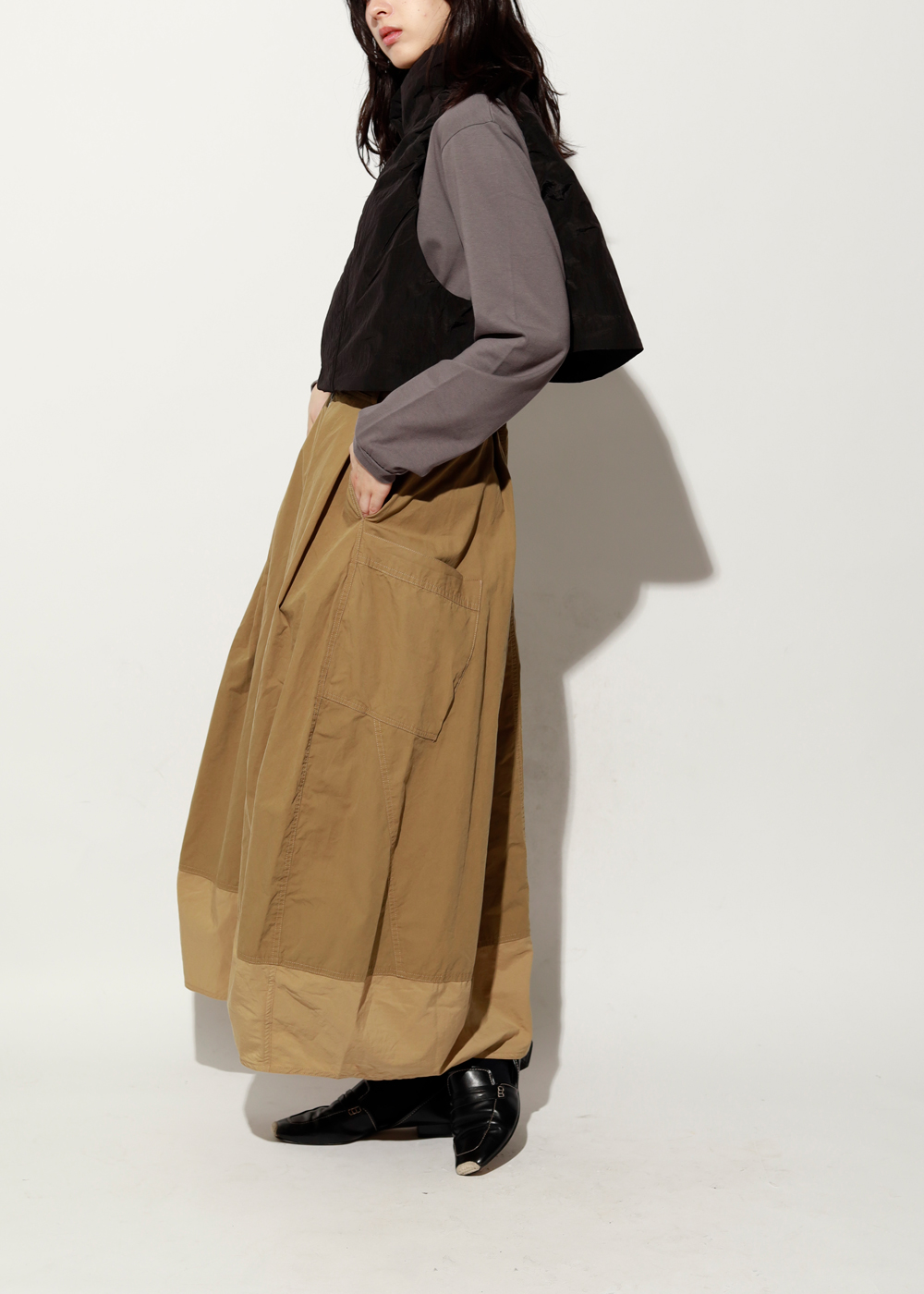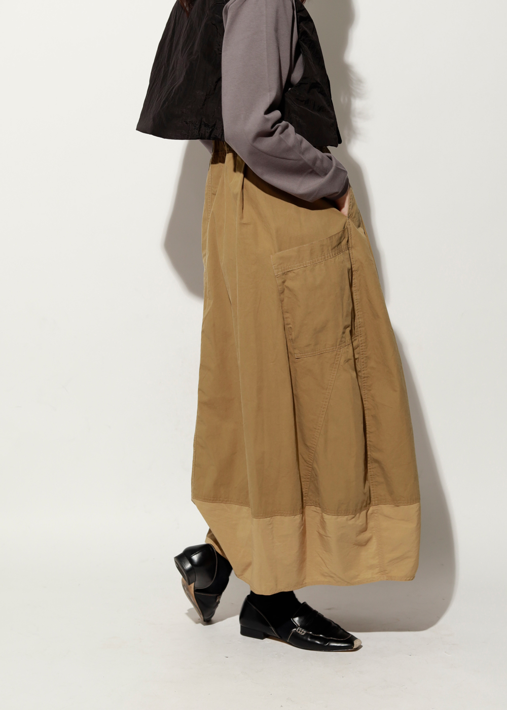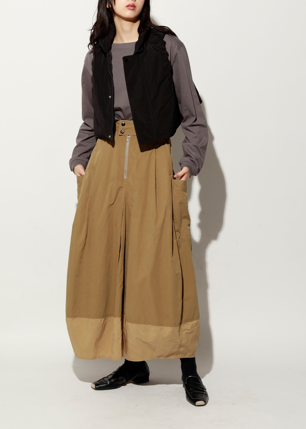 ワイドパンツのような立体感、バレルシルエットで魅せるロングスカート。