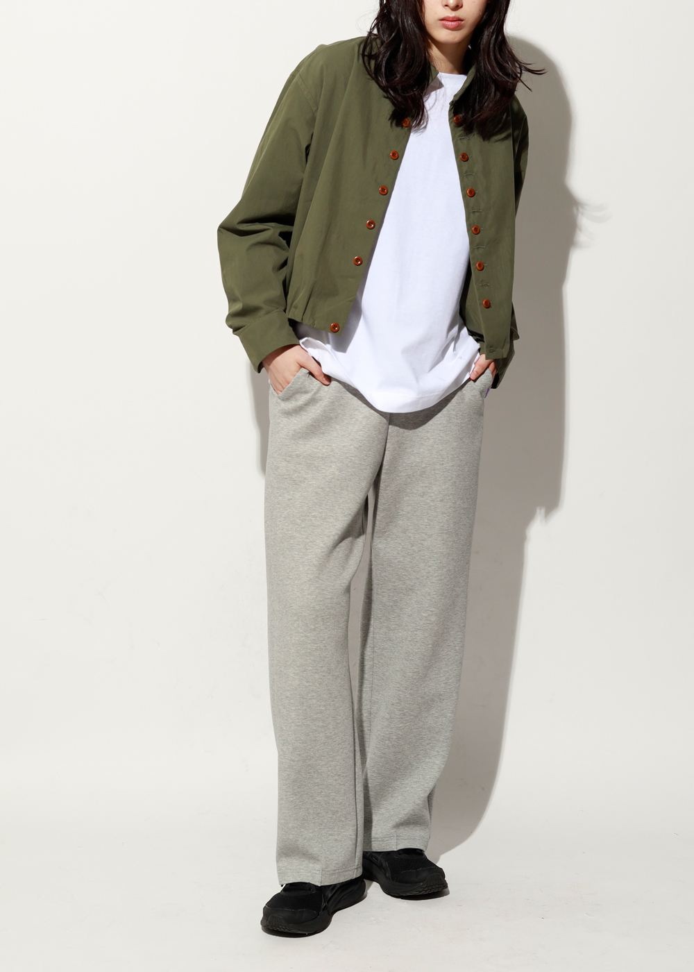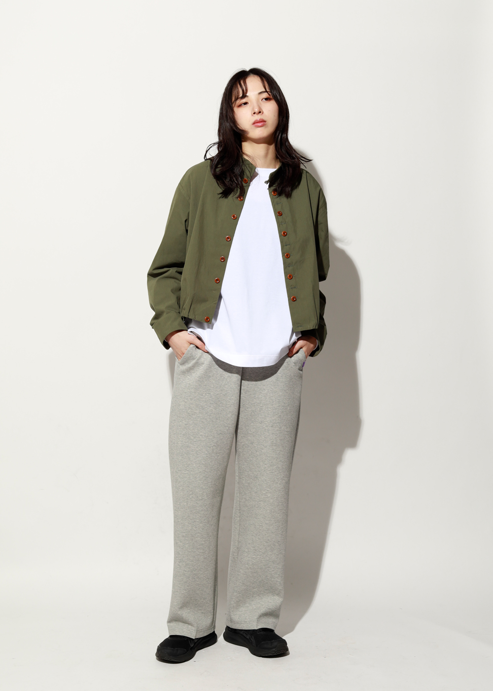 スタンドカラーはすっきり見え、衿を倒してシャツライクにもアレンジ可能。