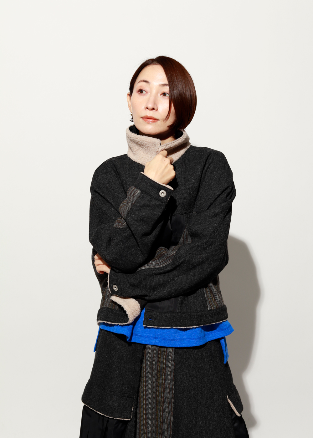 シンプルなスタイルに重ねるだけで、ぐっと洗練された印象に。