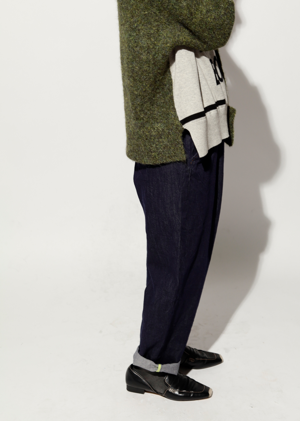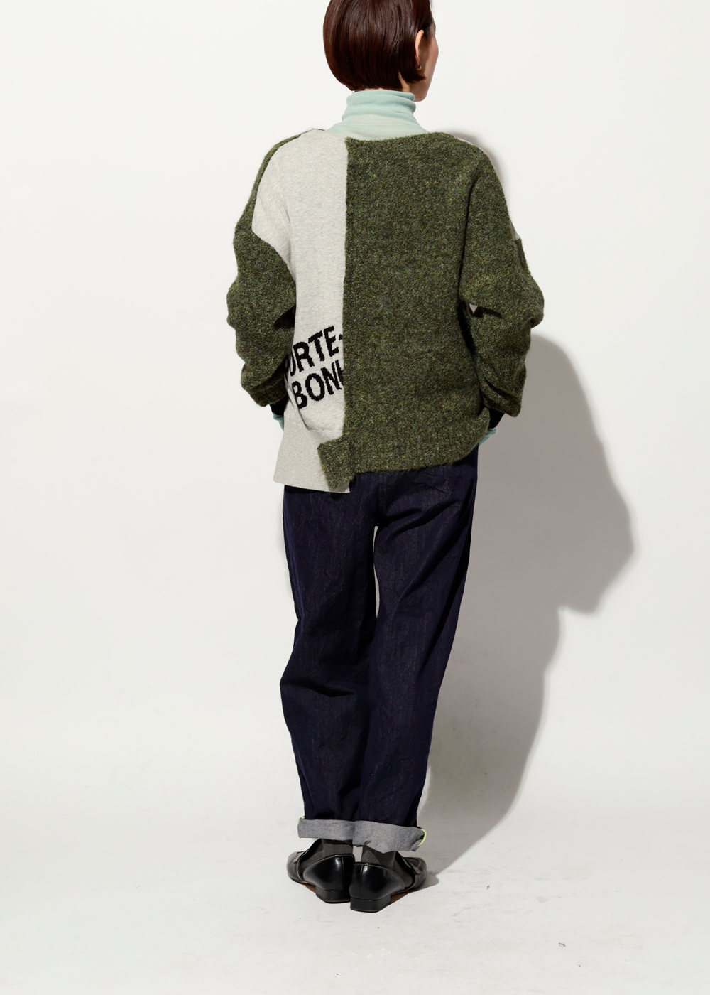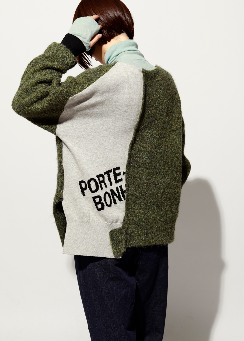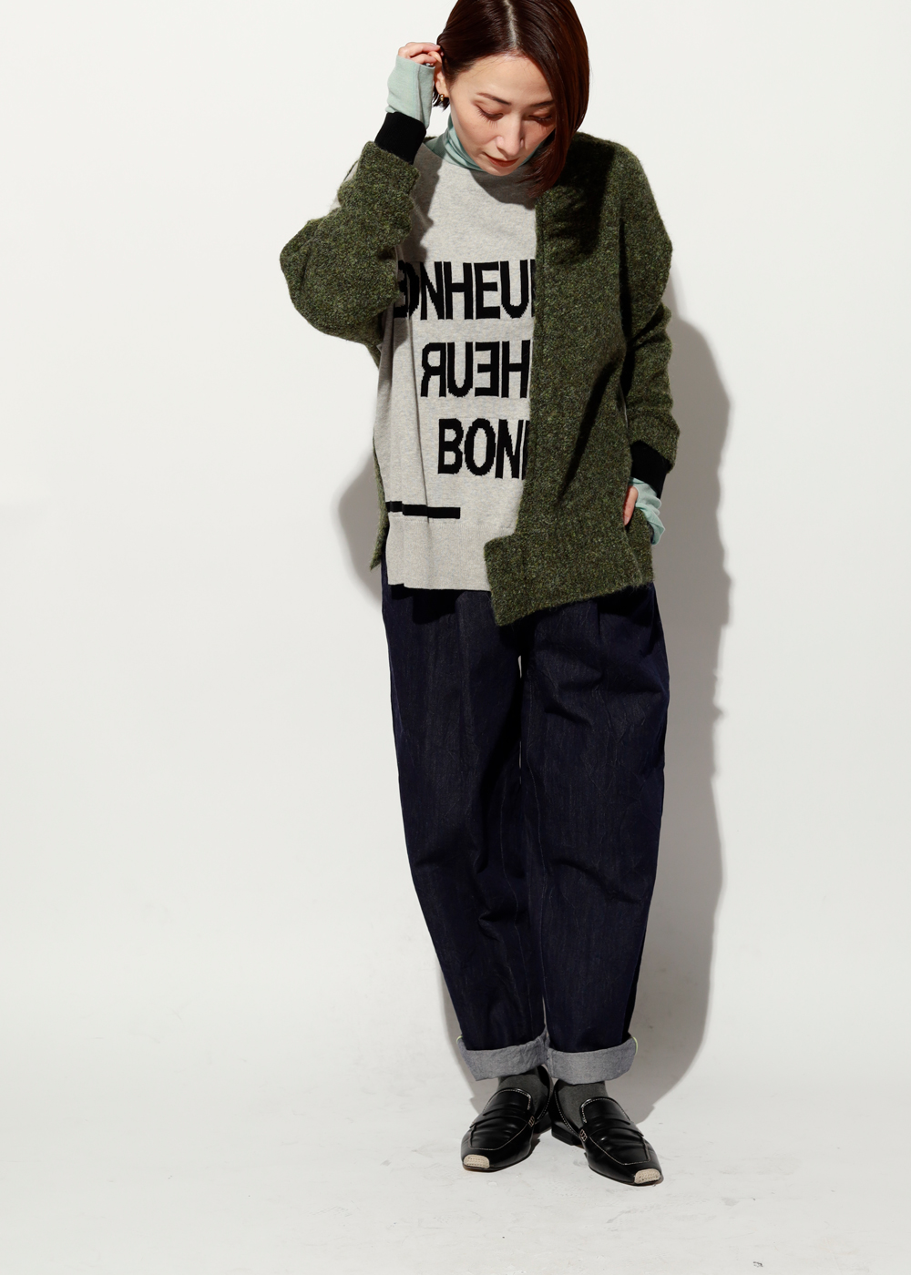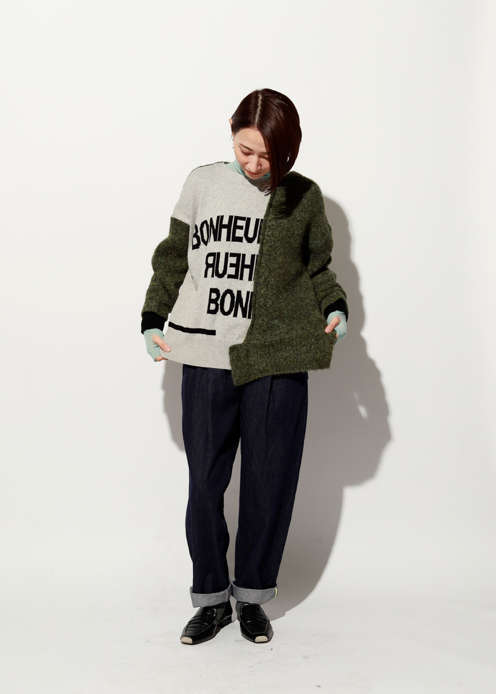 シーズンムードを映す表情豊かなファンシーヤーンに、繊細な糸で描いたロゴが静かに映える一枚。