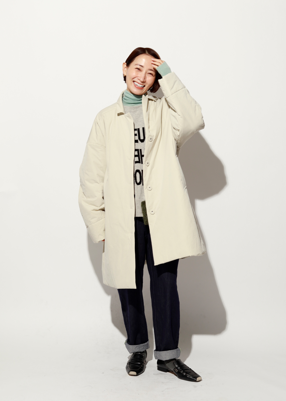 衿元はすっきりと上品に仕立て、どんなボトムとも好バランス。