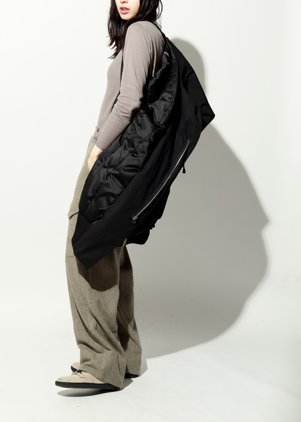 コートを脱いでも背負うように着られるサスペンダー仕様も個性的。