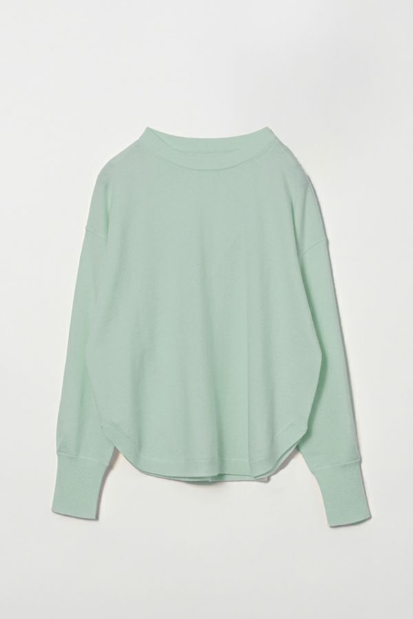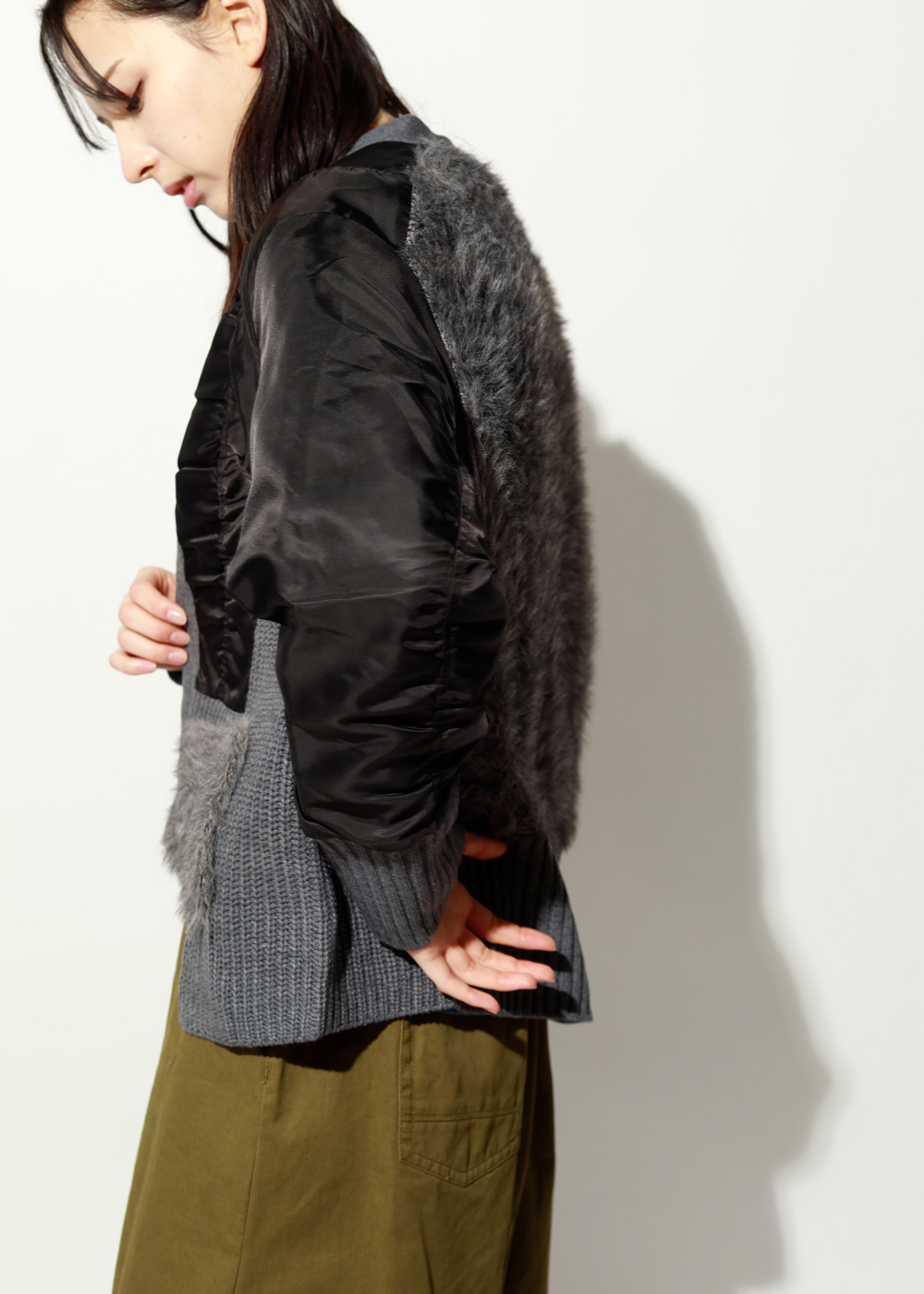 フェザーニットのふわっとした表情と、微光沢素材のシャープさをミックスした一着。