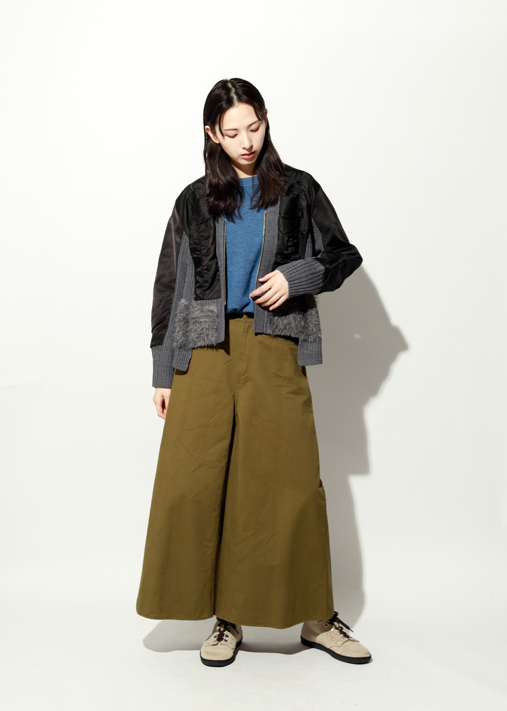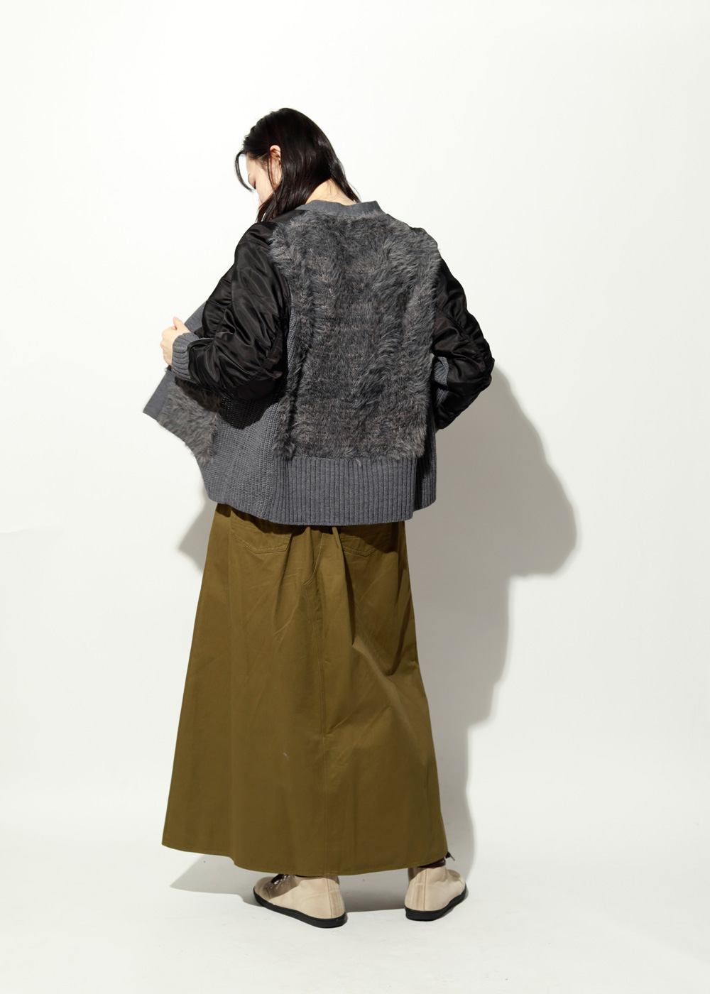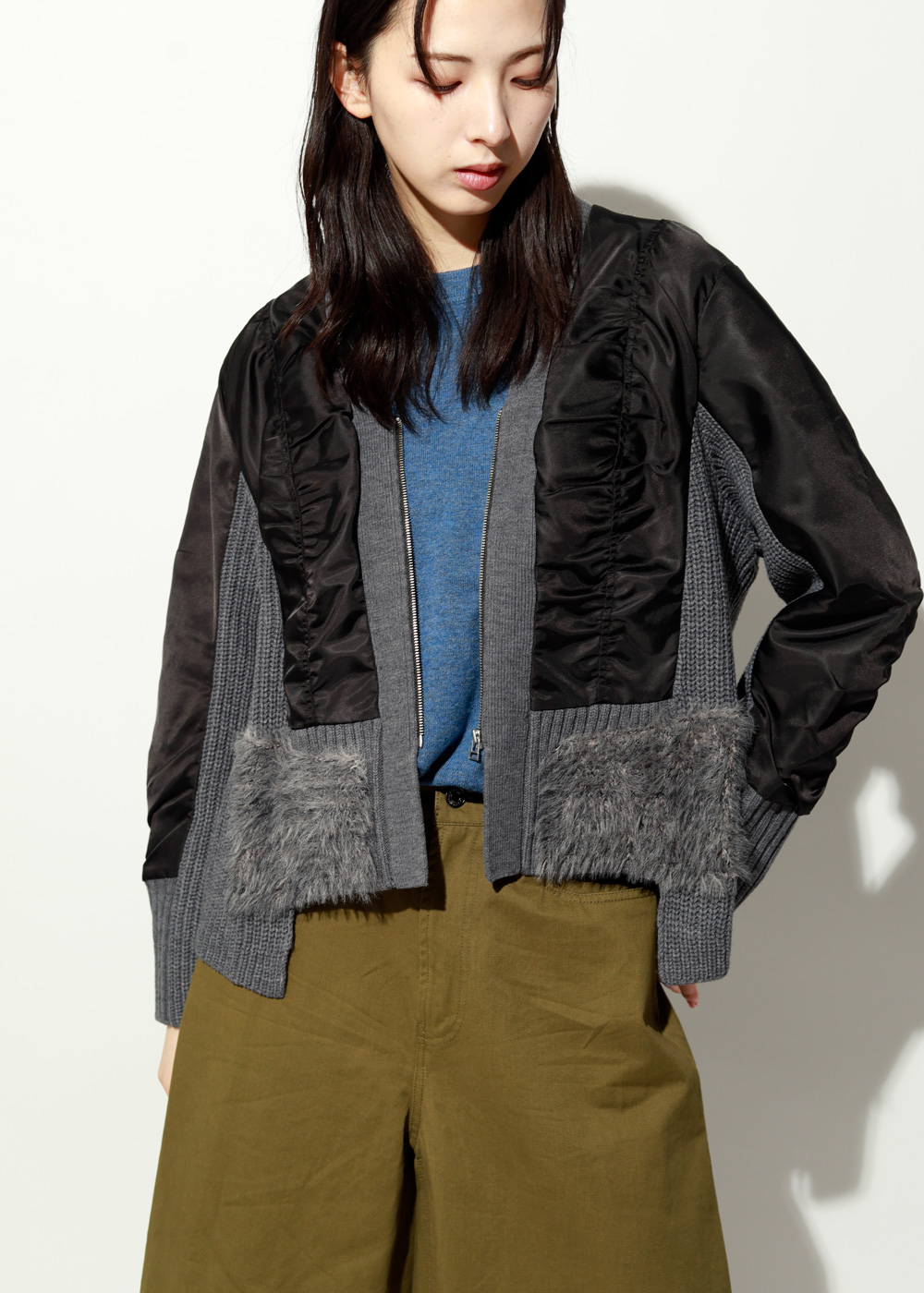 後ろ身頃や袖下はニット切り替えで柔らかく、ブルゾンなのにカーデ並みの着心地です。