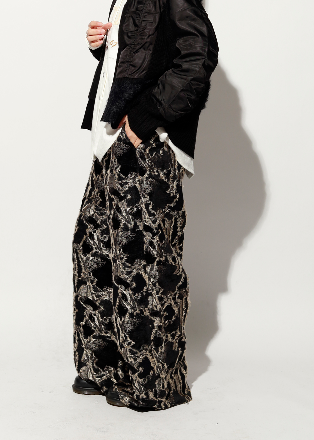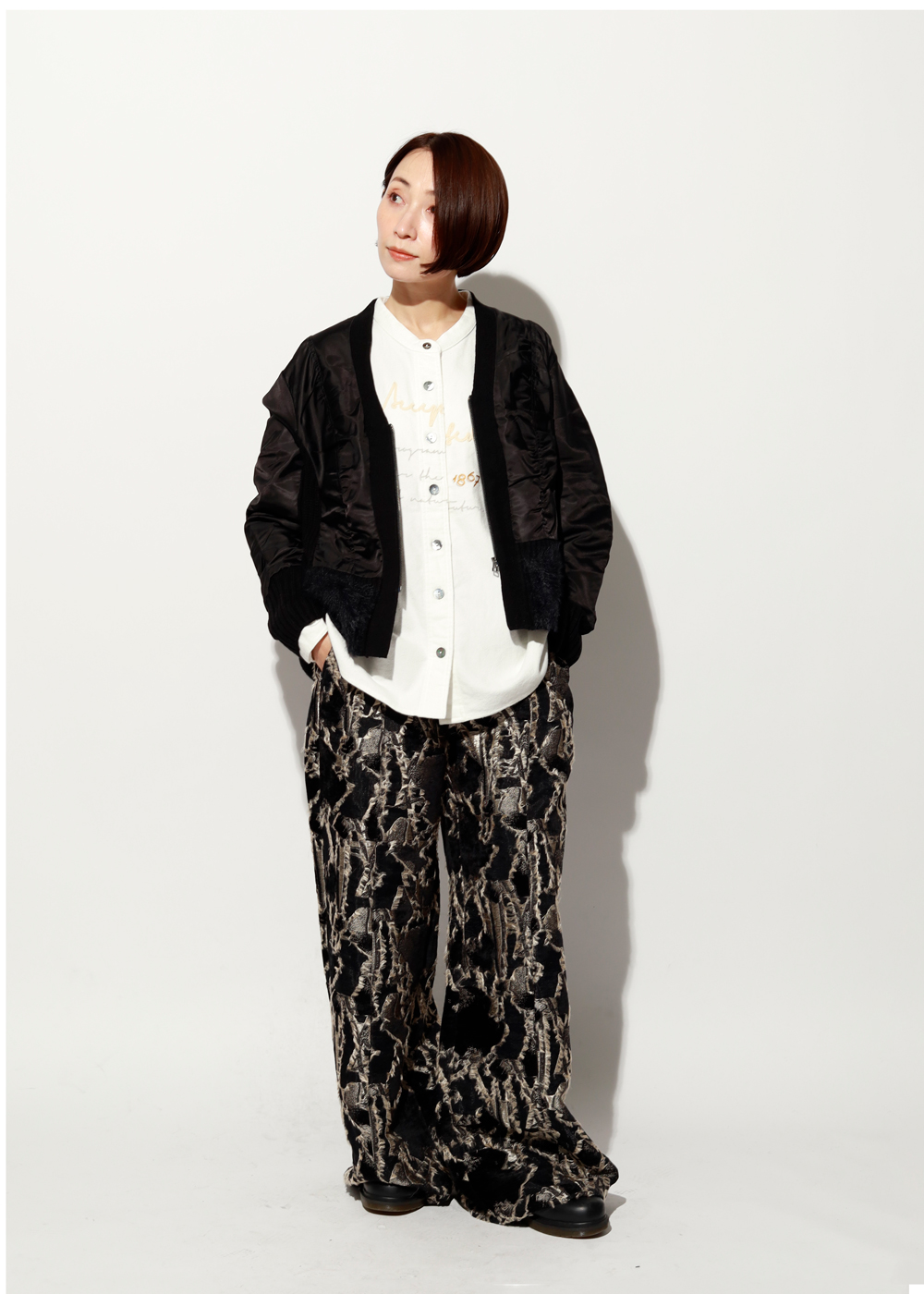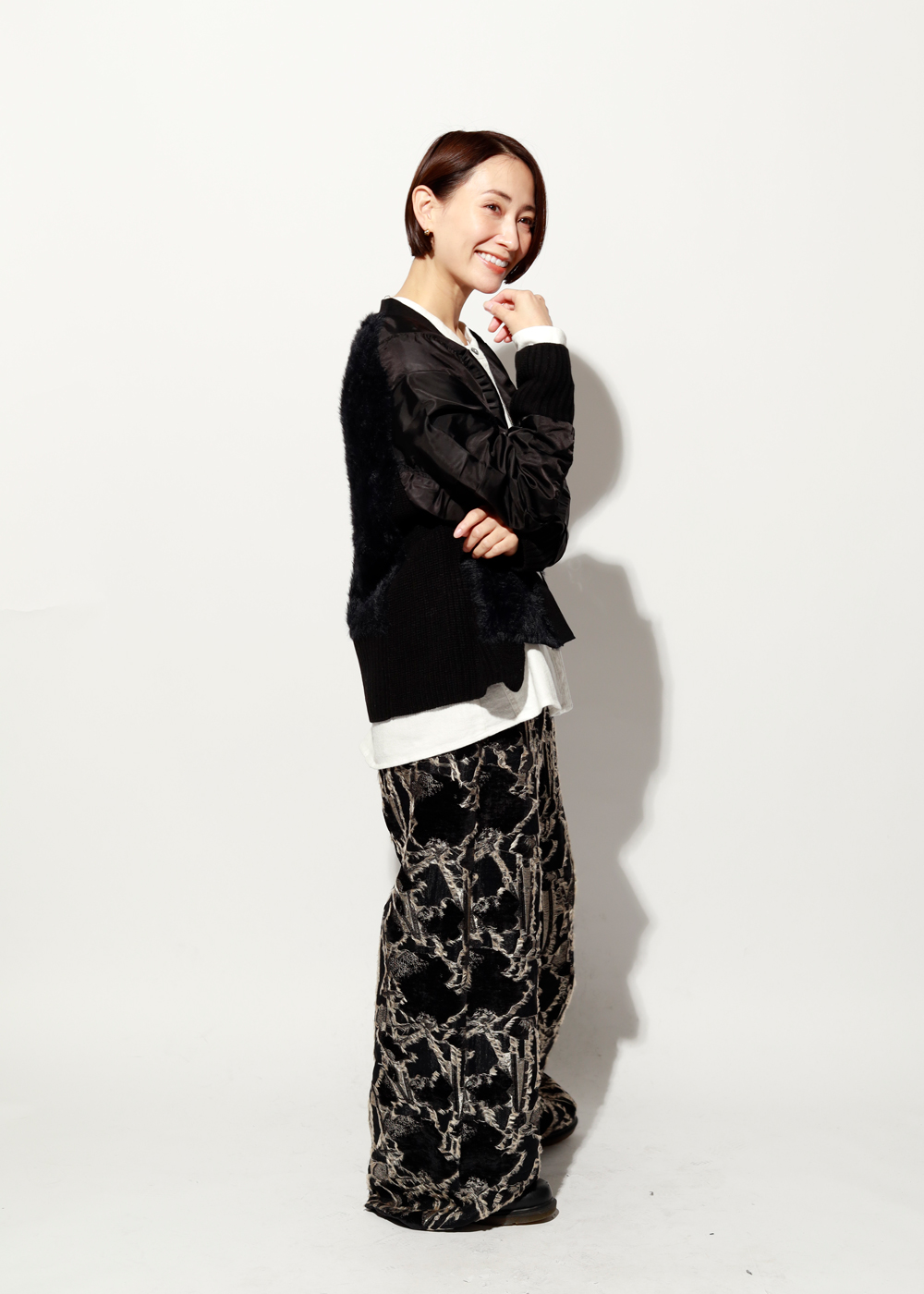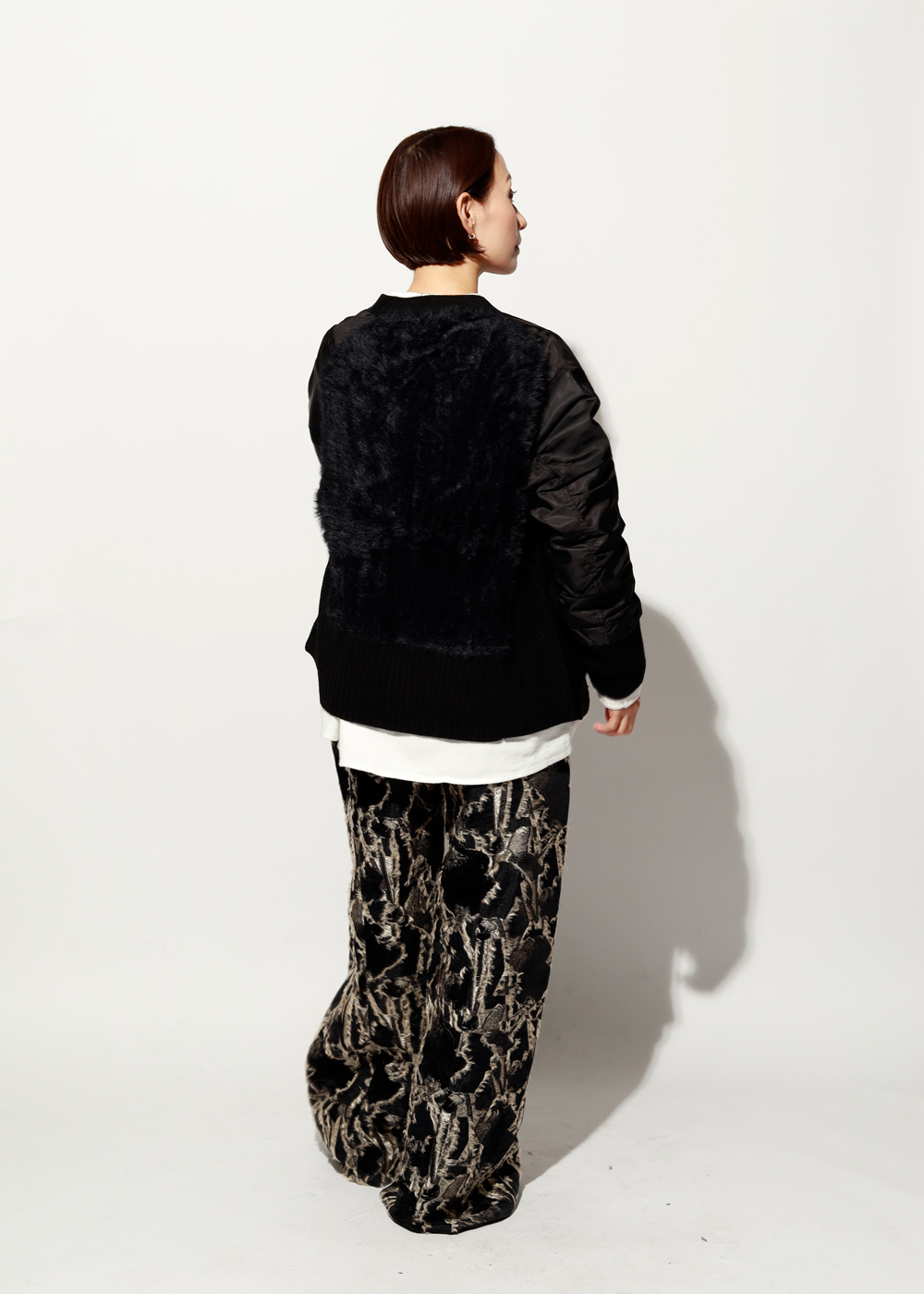 フェザーニットのふわっとした表情と、微光沢素材のシャープさをミックスした一着。