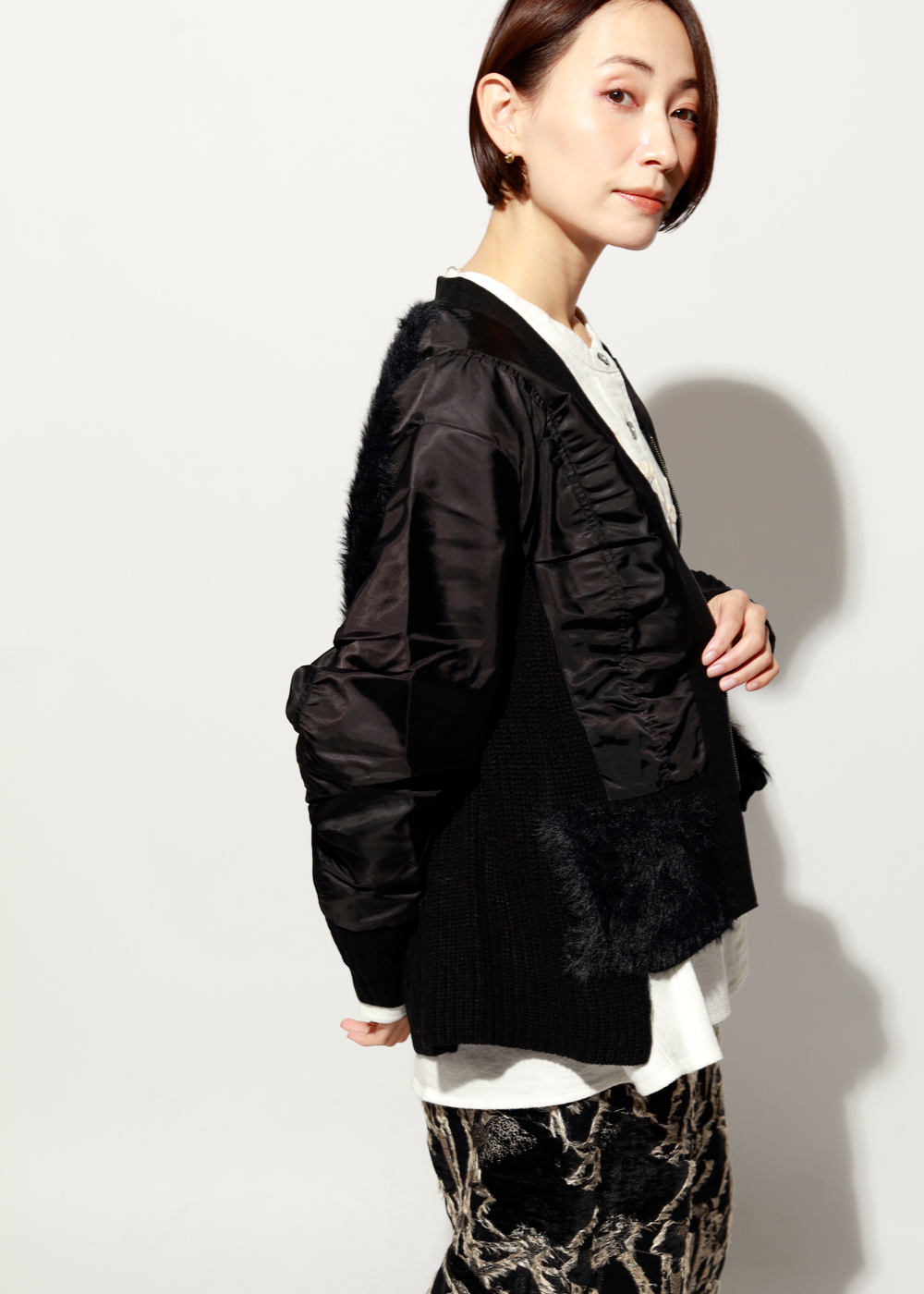 後ろ身頃や袖下はニット切り替えで柔らかく、ブルゾンなのにカーデ並みの着心地です。