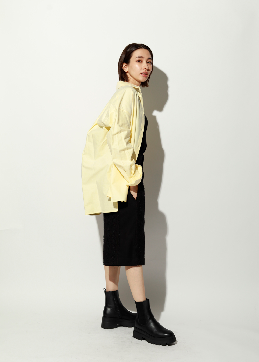そこにイエローのオックスシャツを差し込むことで、スタイリングが一気に軽やかに。