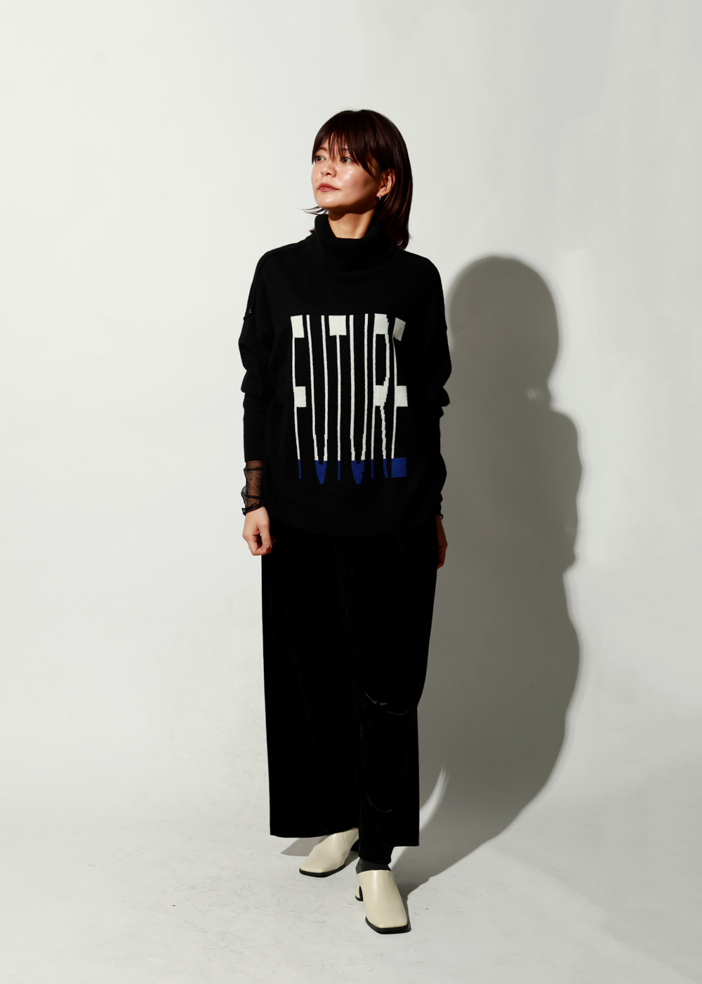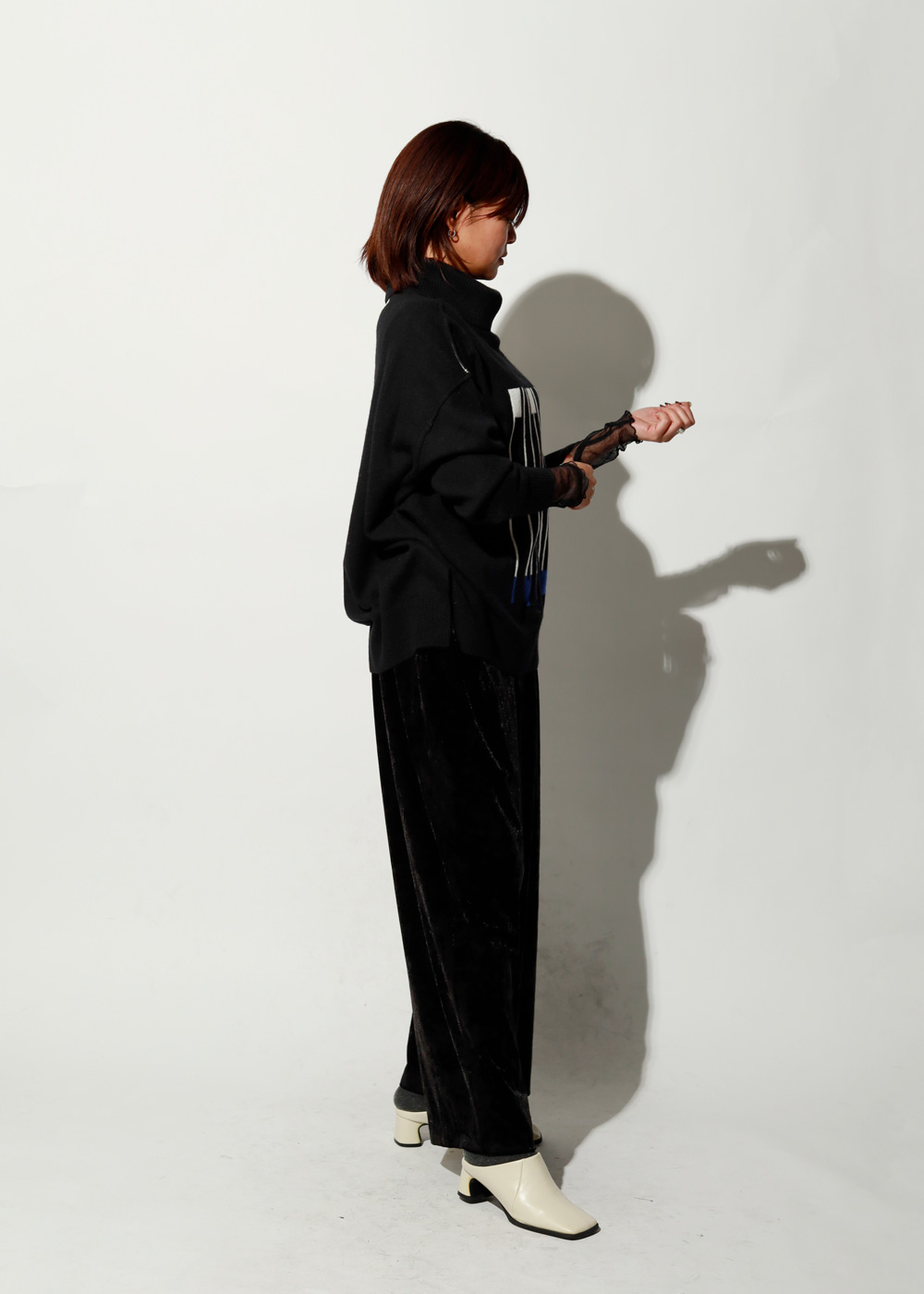 ブラックワントーンに、奥行きのあるベロアの質感が、黒一色でも表情豊かに。
