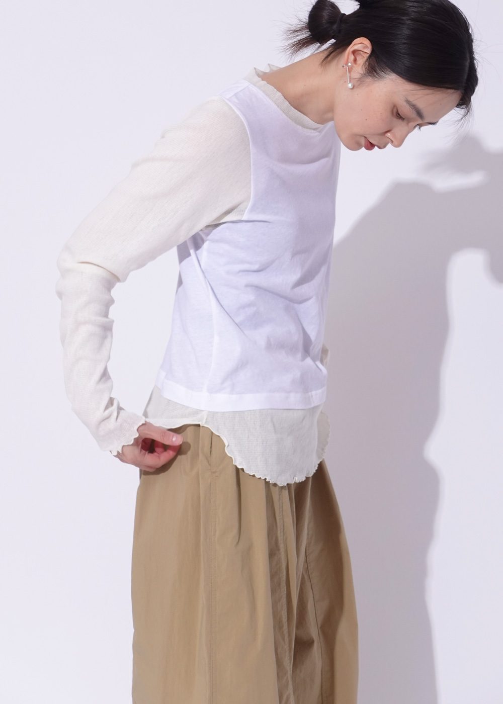 袖口のタックがさりげない引き締め効果を生み、大人らしいバランスに仕上げています。