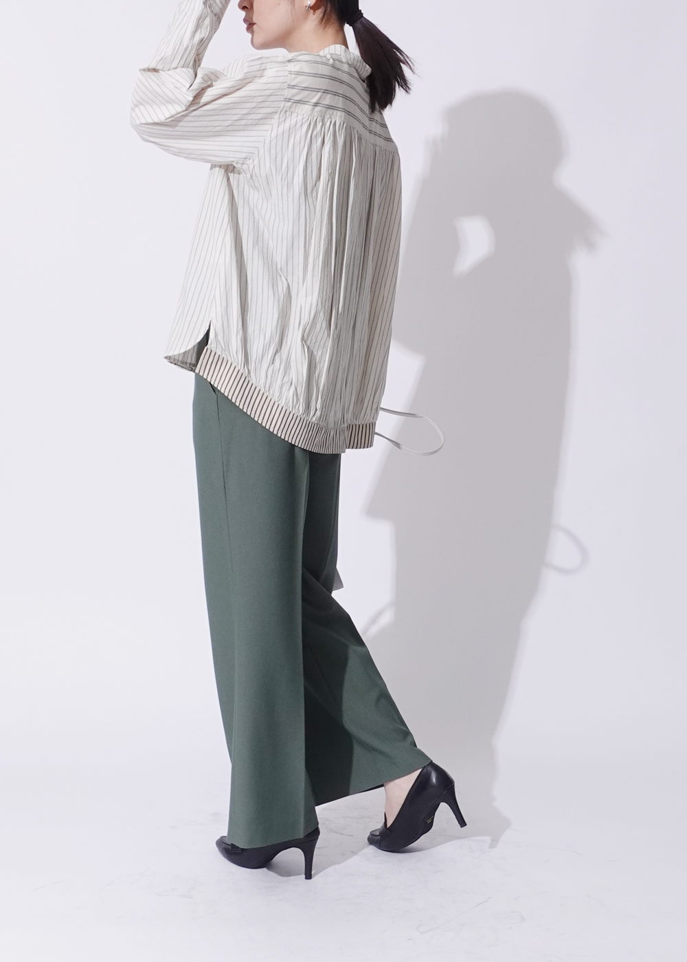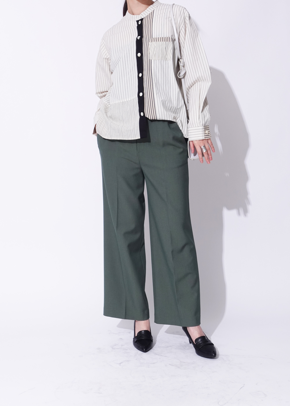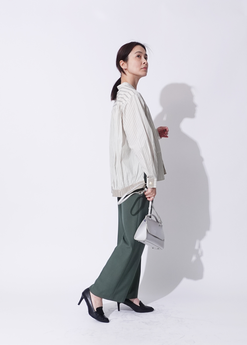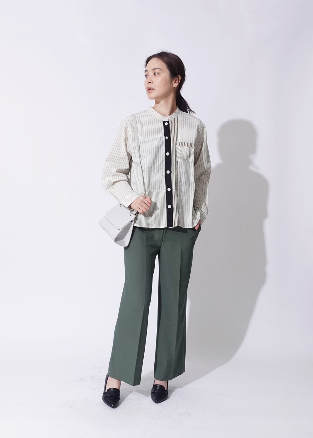 グリーンパンツで引き締める、大人のストライプシャツスタイル。