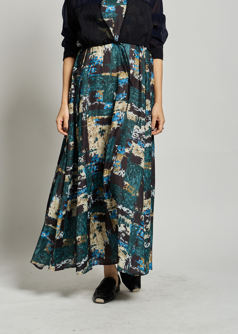 軽やかな素材感が動きにニュアンスを生み、ブラックのフラットシューズでまとめれば、
