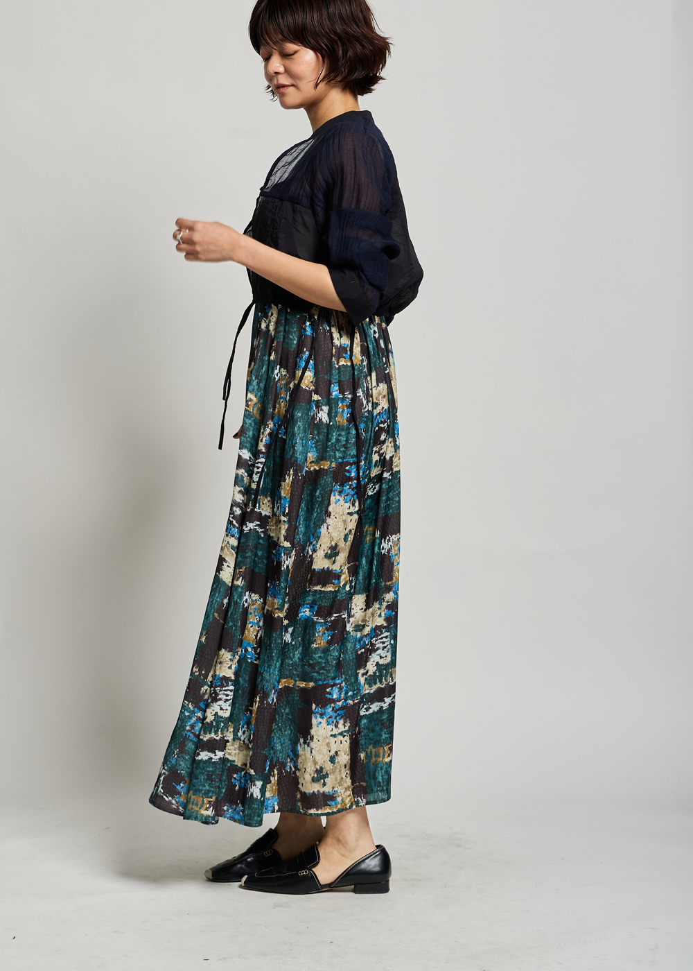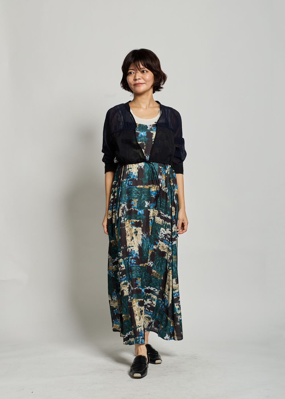 柄ワンピースにブラックを重ねて、落ち着きのある大人の柄スタイルに。