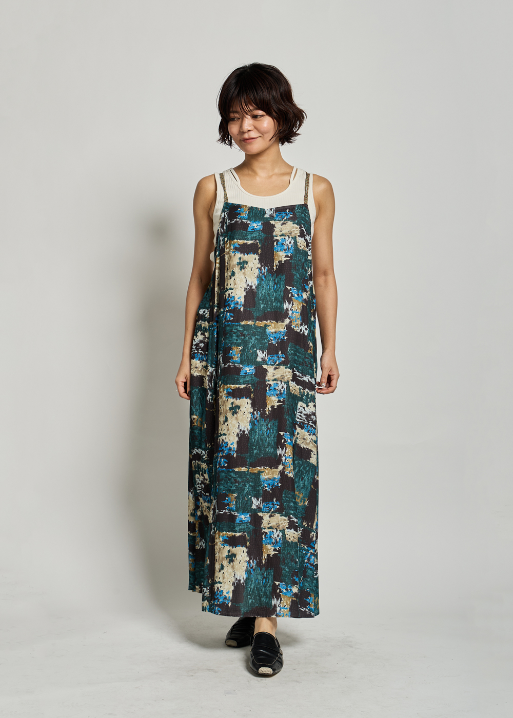 抽象的な柄が目を引くワンピースは、一枚で華やかさと奥行きを演出。