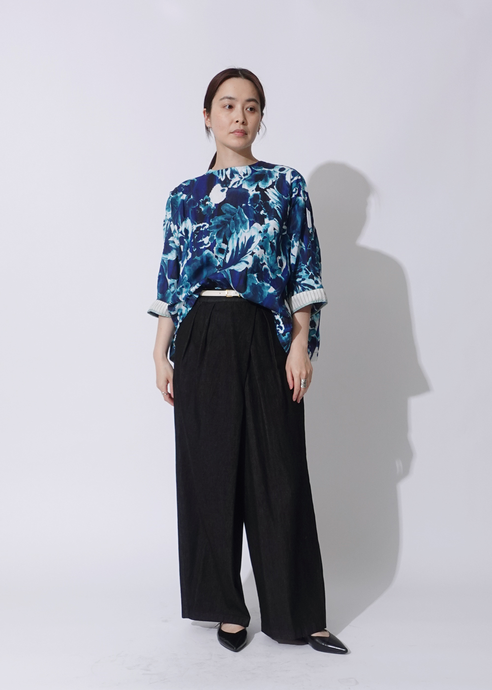 お腹周りの広がりを抑えて、スッキリ見せる工夫をプラスしています。