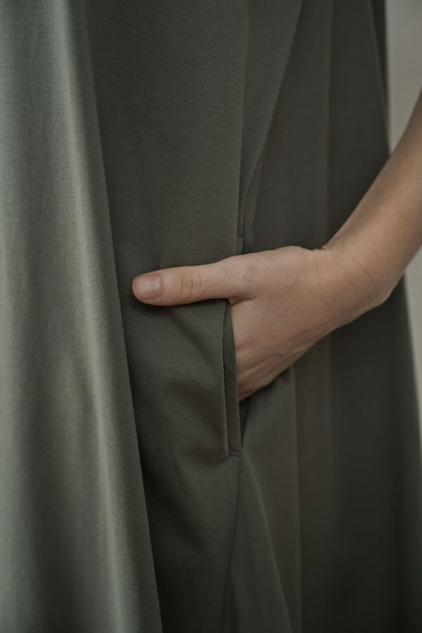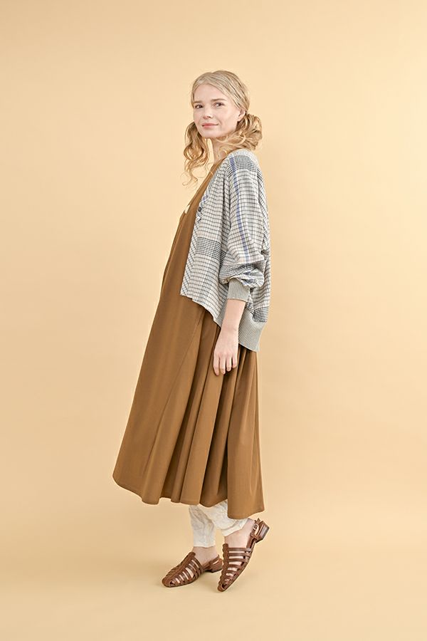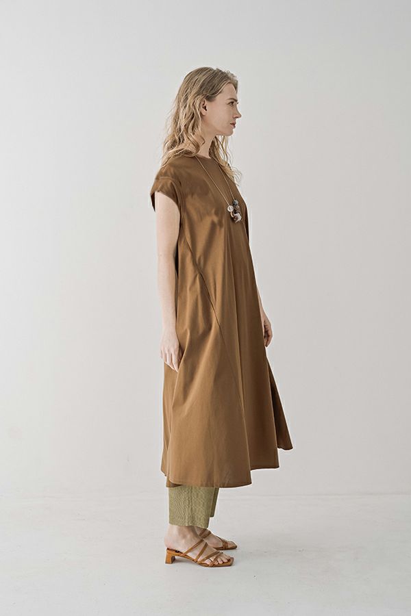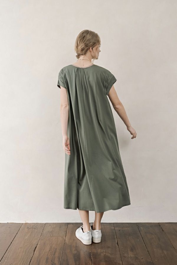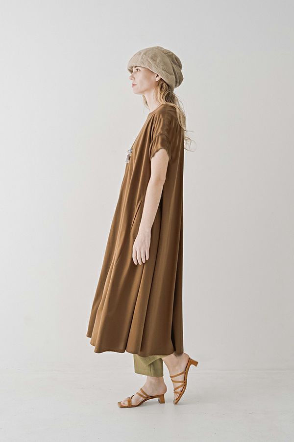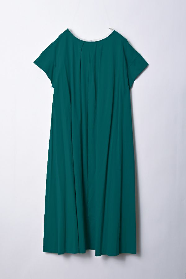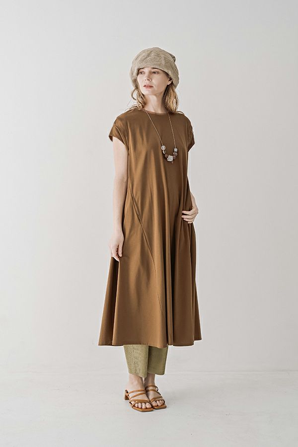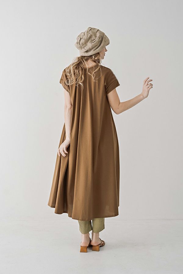 お待たせしました!発売からご好評いただいている半袖ワンピース!待望の再入荷です。新色グリーンが加わり、全4色に! 薄手のシルケット加工のカットソー素材は光沢感あり発色性も良く落ち感もあるので分量感たっぷりでも軽くて楽チン。 体を締め付けず着心地満点のきれいめワンピース。 ドロップショルダーと広めの袖で肩回りをカバーし、前のタテ切替えが全体をスッキリ見せ 脇線が無いのでフレアーラインがきれいにでるシルエットです。 襟元は薄いオーガンジーを使い華奢な印象で顔周りを華やかに見せます。レギンスやソックス+スニーカーやニットボレロと相性GOOD! 追加ブラウン/新色グリーン 4月下旬入荷予定