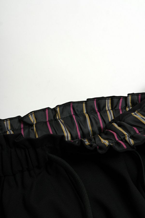ヒップ周りはゆったりさせ、太ももから裾にかけては少しボリュームを抑えてスッキリさせたシルエットです。 ウエストに紐がついているので、ウエストの調節も可能。 シンプルな中に、ベルト裏はカラフルなストライプ使いで少し遊び心を取り入れています。 きれいめ素材なのに、お手入れがラクチンで手洗い可能です。
