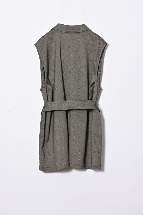 旬のワークテイストなディテールを取り入れたジレベスト。 ポリエステル100%のサラッとした着心地でインナーに合わせる素材を選びません。 トレンドの大きめなボックスポケットに、きれいめなステンカラーのデザインを組合せることで、カジュアル過ぎずクリーンな印象に。 ウエストには取り外し可能なベルト付きで、ベルトを前にも後ろにも留める事が出来き、絞ると よりスタイルアップ見えします。後ろアームにタックを入れて、コクーン型のバックシルエットもデザインポイント。 シャツやブラウスを合わせた上品な着こなしはもちろん、シンプルなTシャツを合わせてカジュアルに着こなすのもおすすめです。甘めのテイスト合わせにも相性が良く、スタイリングに上品さがプラスされます。 ●日本製生地使用