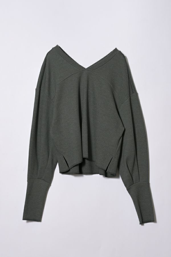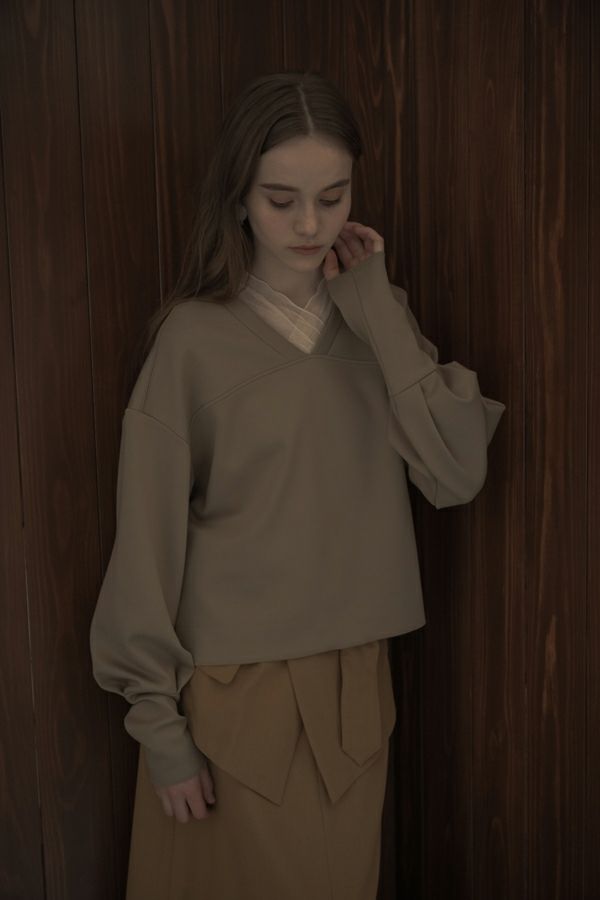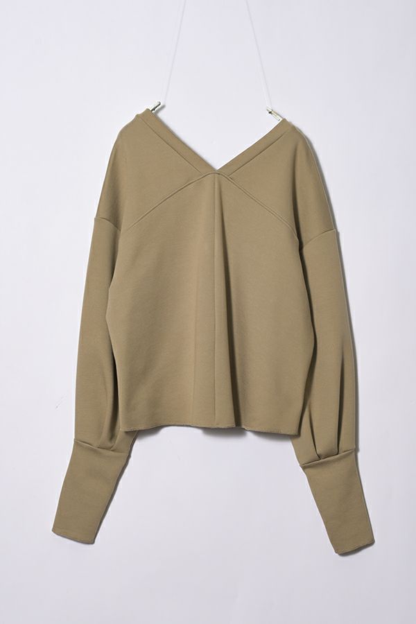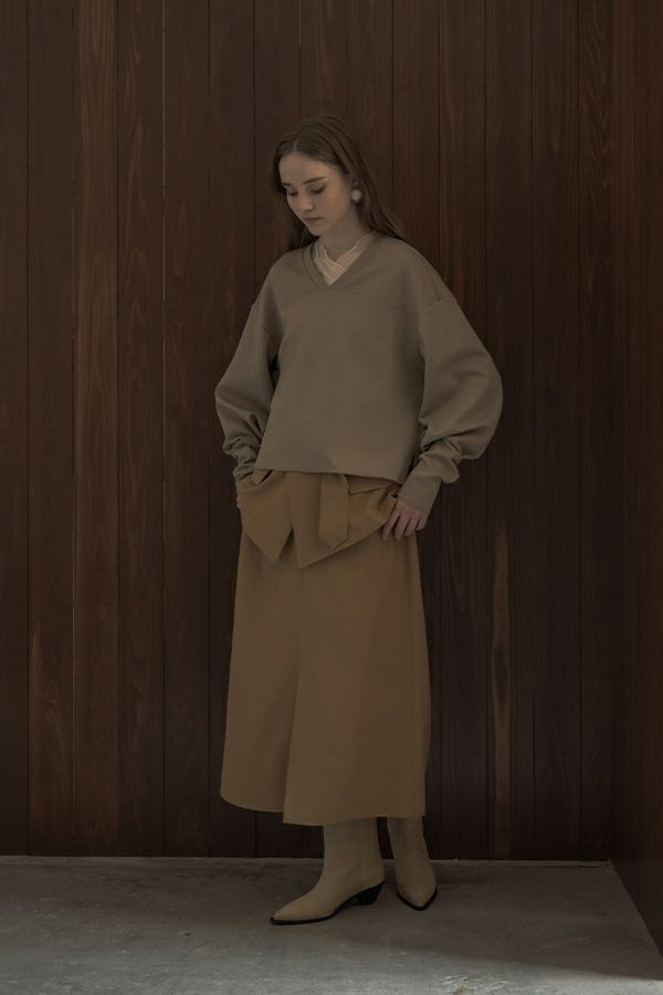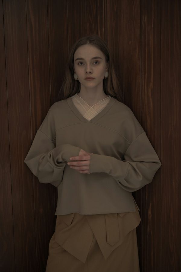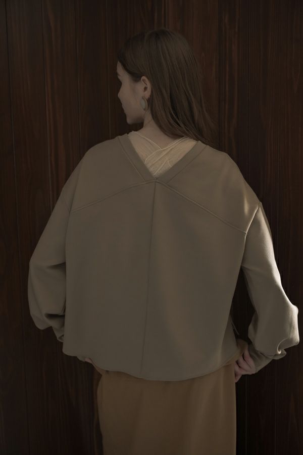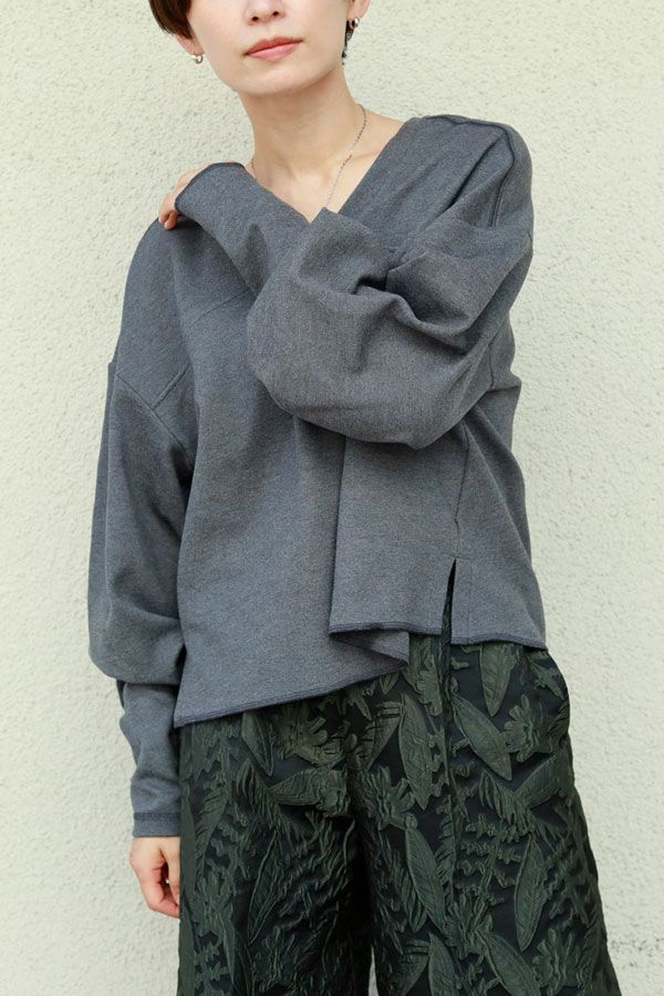モードなVネック長袖カットプルオーバー。 肩先を落としたドロップショルダーと前後のネックラインがしなやかでリラクシーな雰囲気がポイントです。 カットソー素材でカジュアルになり過ぎないように、袖口にかけて絞ったような長めの切替とタックを入れてフィット&ボリュームな袖シルエットにも拘りました。 ラグウォームモイストポンチ生地使用でモチッと感のある風合いが快適な着心地。 タイトスカートやデニムに前裾をウエストインして、後ろに抜いて着るのもおススメです。 インナーにブラウスやカットソーを重ねて、裾を出すレイヤードスタイルも◎ ラグウォームモイストポンチとは →湿気や汗を熱に変える吸湿発熱性がある為、暖かさを実感できます。 加工工程に拘ることによって生み出されたソフトな風合いと滑らかな肌触り に加えストレッチ性にも富んでいるので、心地よい着用感が楽しめます。 ピリングもしにくく、機能性・ファッション性・安定性を兼ね備えたJapan quality 素材です。