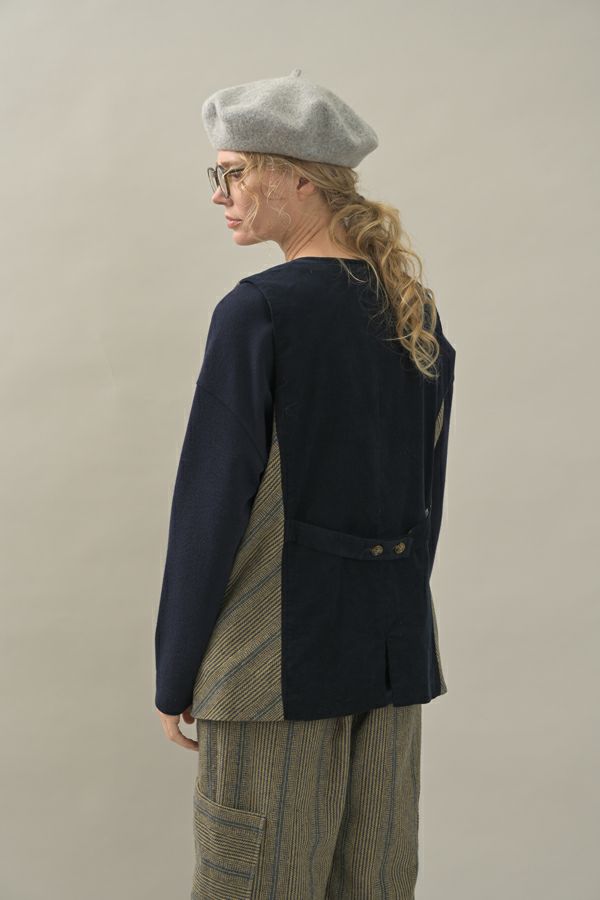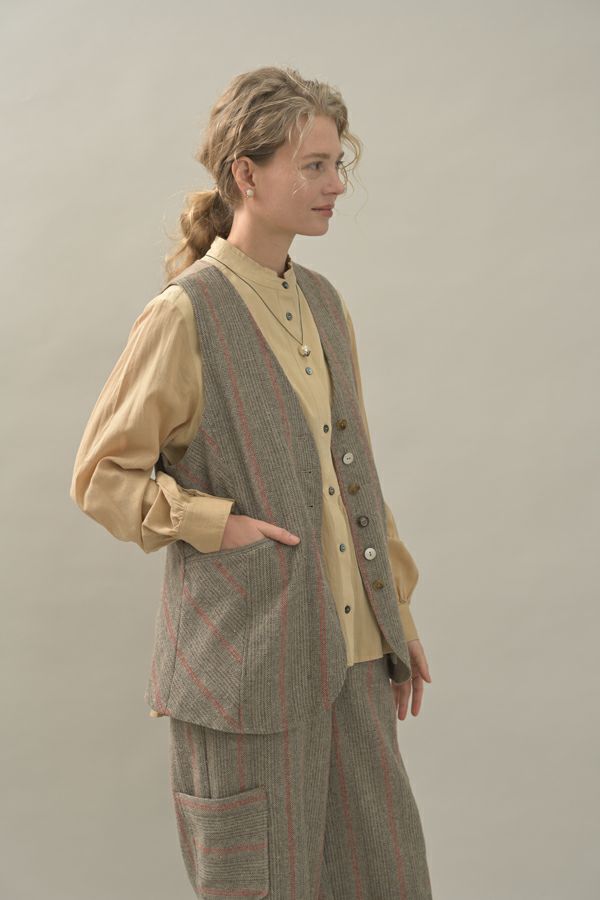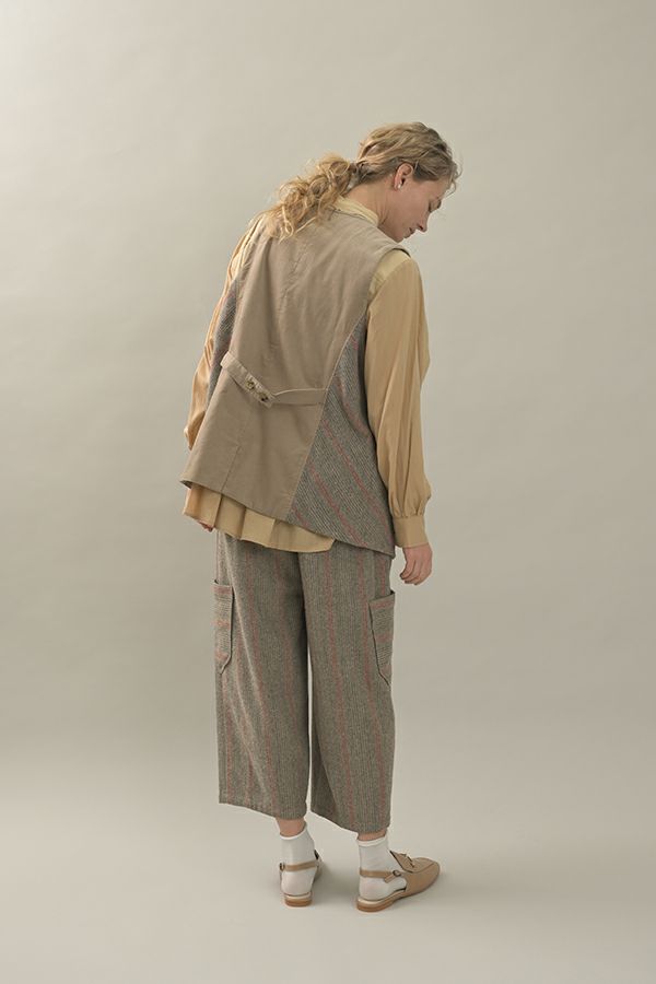 クラシカルな印象のツィードベスト。 後ろ身頃はソフトな細コーデュロイの配色で背中をスッキリ見せ、メリハリを。 バックベルトが腰高に見せ、スリットで動きやすい仕様にしています。 前立てのボタン部分は、数種類の個性的なボタンをあしらい遊び心もプラス。 袖ぐりを大きくくってるのでゆったりとしたインナーにも着合わせしやすいです。 同素材のツィードストライプパンツ(24238-9773B-R)とセットアップ可能です。