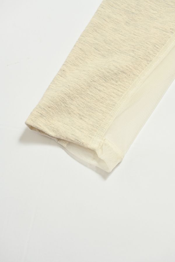 トレンドのパワーショルダーが目を惹くロンTEE。 シャリ感とドライな手触りが特徴的な生地感が新鮮。肩~袖にかけてボリューム感が加わったデザインのパワーショルダーは、存在感抜群。 身頃の両サイドをドローストリングさせ、シャーリングを作ると裾がカーブになり、全体にバランス良く立体感が出ます。 衿と袖下にメッシュ地の切替を入れ、程良いシアー感と華奢見えの要素もプラス。 後ろ姿にも拘りのアクセントを。大人っぽいレタリングで『Destiny』のロゴプリント入り。 存在感のあるデザインでワイドパンツ合わせから、タイトスカートなど幅広い着こなしと好相性です。メンズライクなボトム合わせで、大人のこなれ感あるスタイリングがおススメです。