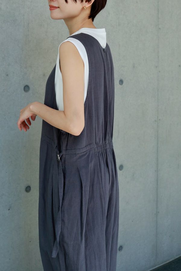 リラクシーカジュアルにピッタリな、抜け感大人コンビネゾン。 ヘリンボン地の綿/麻にレーヨン系素材の入った滑らかな質感。柔らかな肌触りが合わさり着心地良く、カジュアルだけどakaneらしさのある大人っぽいアイテムです。 ゆとりのある身幅に大きなカーブをつけた袖ぐりが特徴で、下に着るものと羽織りものを選ばず、脇ゴムと前後のベルトバックルでサイズ対応出来ます。背中に入れた長めスリットは背中をスッキリ綺麗に見せ、後ろウエストのゴムギャザーはヒップ周りをカバーし腰高に見せ、大人が着映える仕掛けに。 インナーに合わせたタンクトップと透け感のある羽織りでライトなカジュアルスタイルを提案。