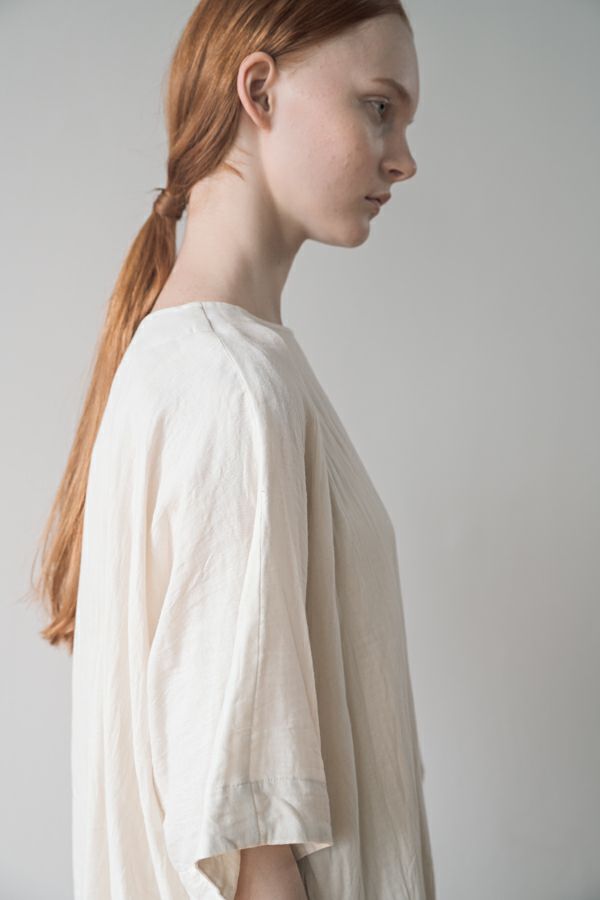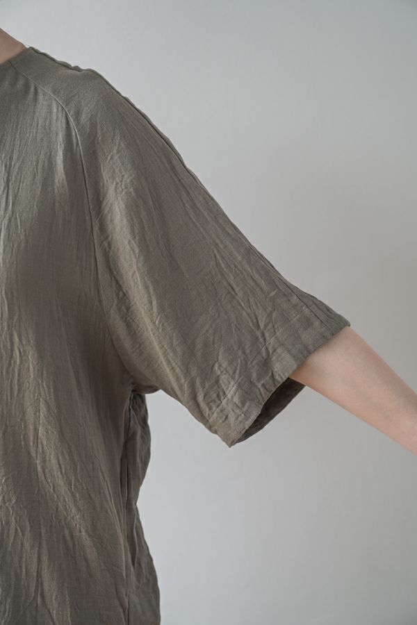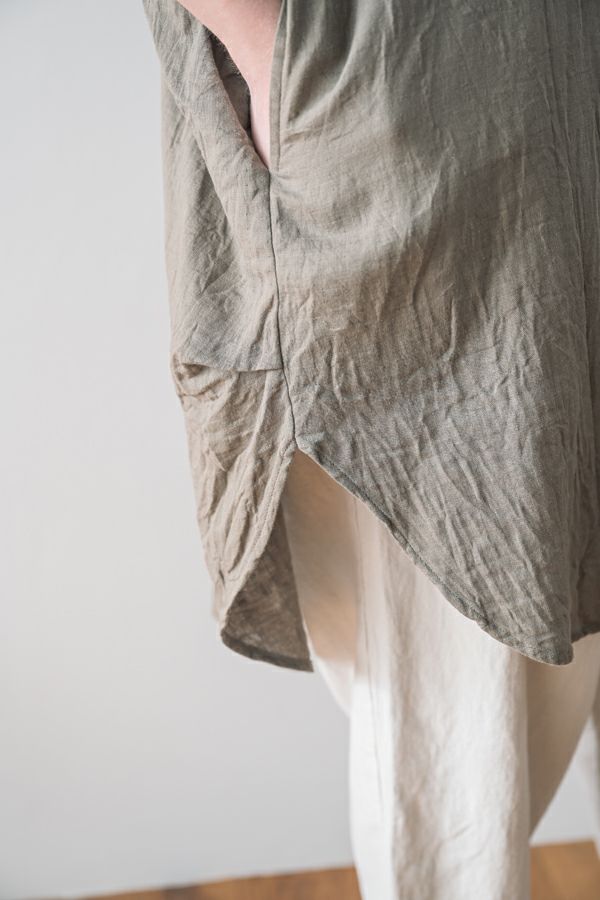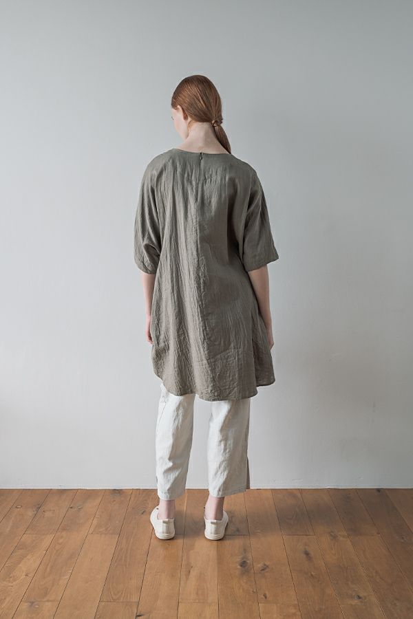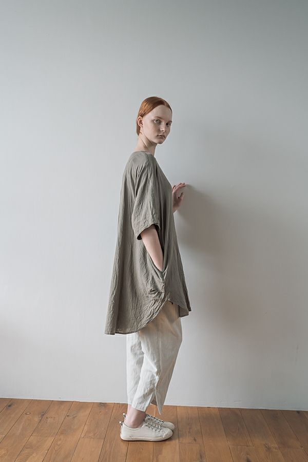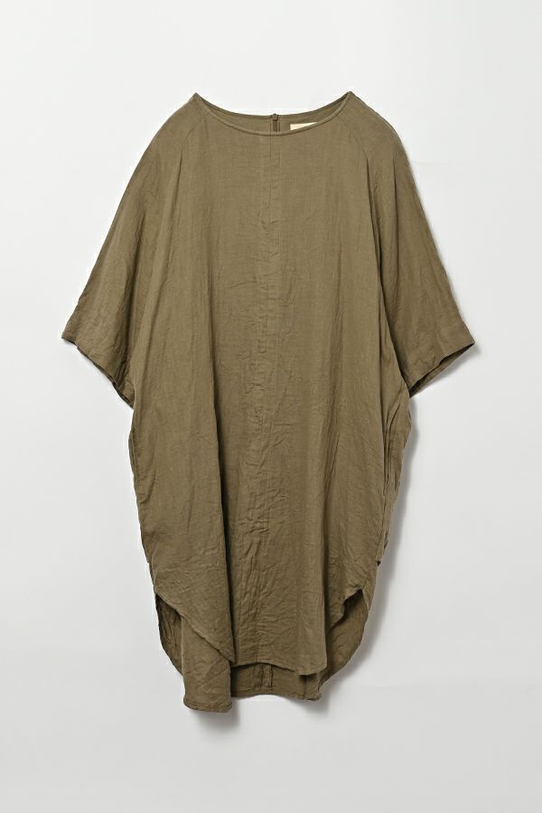 デリケートなお肌の方にも安心の着心地を提案、ナチュラルなチュニックワンピース。 今夏から新シリーズの「BINKAN-SAN」 *カサカサした乾燥肌 *ホルモンバランスや季節によってゆらぐ肌 *アレルギーの痒みや肌トラブル *静電気の刺激で痒みやチクチク ずっと敏感肌で悩んでいたデザイナー目線でデリケートなお肌の方にも安心の着心地を提案します。素材だけでなく内側の縫製にも気遣い、一番気になるチクチク感が無く、オールシーズンにわたり、つい手に取ってしまうシリーズです。 日本製のソフトで膨らみのあるダブルガーゼ素材は、イージーケアでソフト。サラッとした肌触りが良い、自然な風合いそのまま、ノーアイロンで着用可能。 体を包みこむようなゆったりした分量感とラグラン袖。気になる体形をすっぽり隠しながら1枚でサマになるコクーンシルエットアイテムです。 前中心の縦に入っただダブルステッチと、前寄りの脇線が視覚効果でスッキリ見せてくれます。大きくラウンドした脇裾と深いスリットで、足さばきも良く歩くたびにソフトな素材感に動きが出て、大人の余裕を醸し出す。 ●日本製