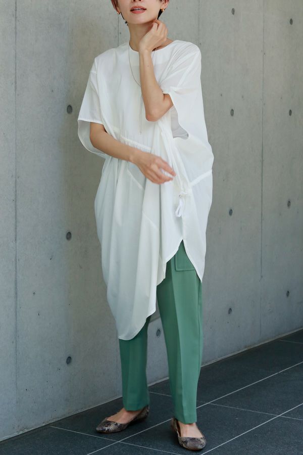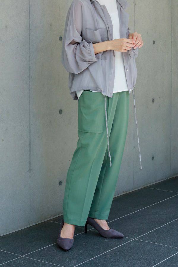 穿くだけで即美脚、涼しさと快適さを兼ね備えた極上パンツ。 縦ストレッチが効いた軽やかで涼しいジョーゼット素材のスティックパンツ。 シワになりにくく、快適な穿き心地が魅力です。 両サイドのパッチポケットがヒップ周りをカバーし、美しいシルエットを保ちながらも、楽な着心地を実現。前中心にギャザーを入れずスッキリと仕上げ、センタープレスで脚長効果も抜群です。きれいめな仕上がりながら、脇から後ろ部分はゴム仕様で、長時間の着用でも快適。 トップスを選ばず、着回し力抜群の一枚です。 この夏、あなたの新定番パンツになる予感。