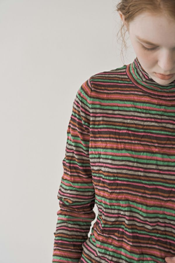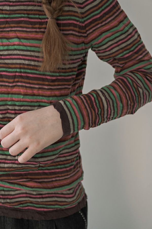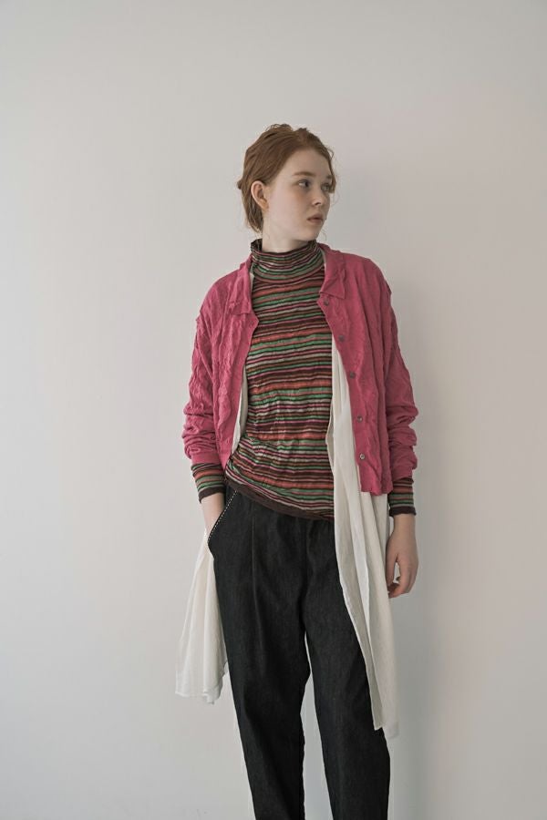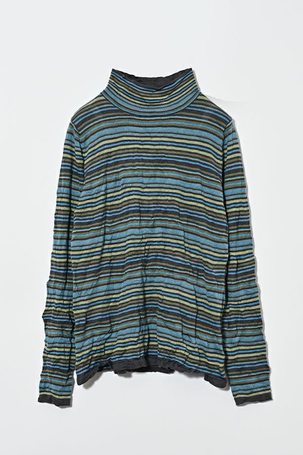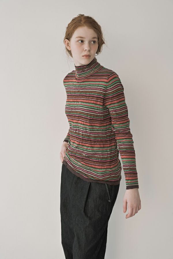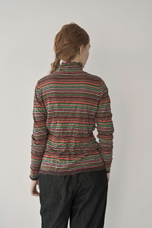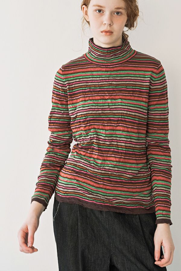 変わらない心地良さ、ずっと頼れる定番のシワボーダープルオーバー。 毎年人気のシワ加工のボーダープルオーバーが今季は華やかな遊び心あるマルチボーダーでご用意しました。細かいピッチのボーダーはスッキリとした女性らしさを持ちつつ、複数の彩りがアクセントになるマルチボーダーです。 着膨れしないシルエットでインナーに使いやすくレイヤードに大活躍します。マルチボーダーが持つカジュアルさと華やかさが1枚着でもインパクトを出せるので、シンプルなアイテムやベーシックカラーを合わせるのがお薦めです。ハイネックが暑く感じる時期は衿を折り返して着用すると内側の無地衿がアクセントとなったチビハイネックとしてもお楽しみいただけます。 ①洗える! ②薄手でソフト、肌触りが良い ③元々シワが入っている為、洗いざらしのまま着用可能 ④小さくなるのでバックに入り旅行に最適 ⑤旅先やお出掛け先の気温調整にレイヤードで大活躍