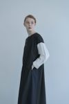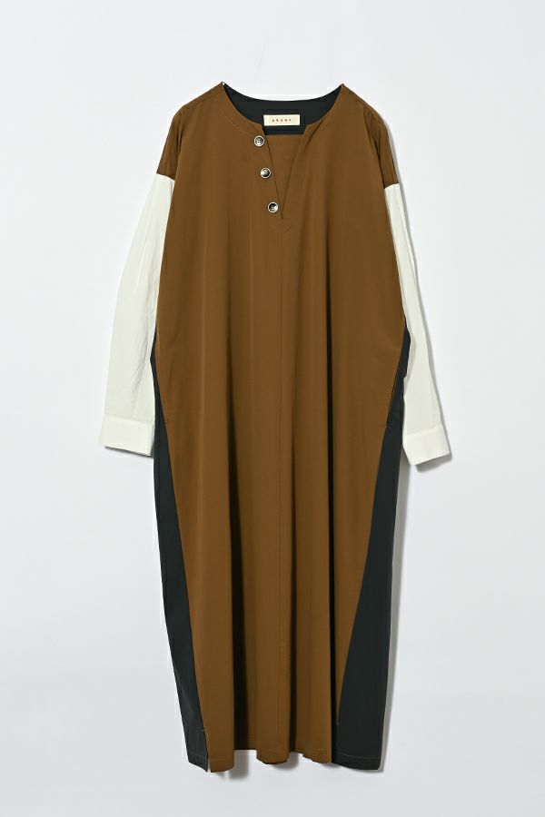 ストンと着るだけで決まる、ボックスシルエットのVネック風ワンピース。 軽くて柔らかく、ストレッチ性のあるナイロン素材を使用。軽やかなのに立体的なシルエットが叶う一枚です。 マチの入ったボタンアクセントが胸元をすっきり見せ、女性らしい印象を演出。白いシャツ袖が上品で高級感をプラスしつつ、脇の配色切り替えやフロントのボタンデザインが程よくカジュアルな雰囲気を加え、バランスの取れた仕上がりに。 素材には適度なハリ感があり、シワになりにくいのも嬉しいポイント。着こなしのアレンジも自由自在。カジュアルに楽しむなら、スニーカーやサイドゴアブーツと合わせて◎アクセサリーをプラスすれば、オケージョンシーンにも対応可能。 1枚でさまざまな表情を楽しめる、万能ワンピースです。