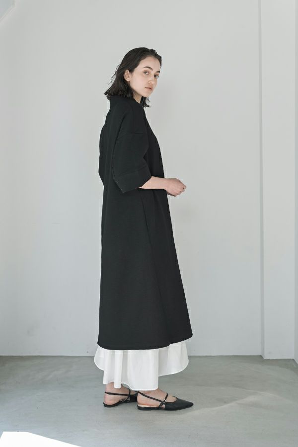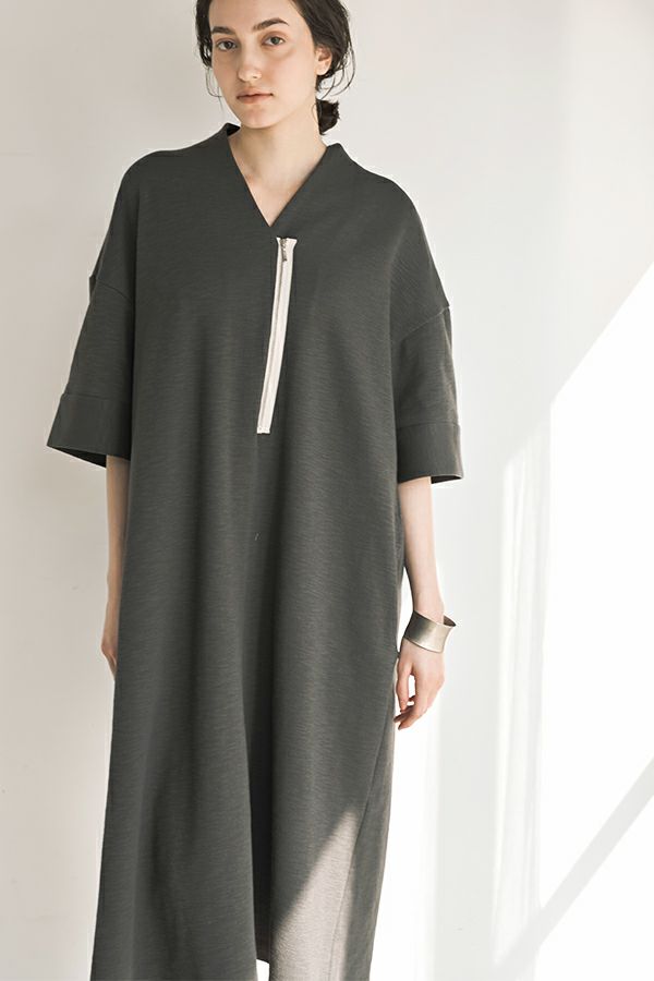 構築的シルエットで魅せる、マニッシュエレガンスなワンピース。 表面感のある綿ポリエステル糸を使用し、ハリと落ち感のバランスが美しい素材感が魅力。体のラインを拾いすぎず、凛としたシルエットを描くことで、着る人の存在感を惹き立てます。 デコルテが美しく映えるよう計算されたネックラインに、配色ファスナーをあしらい、開き具合で印象の変化も楽しめる仕様に。1枚で装いが完成する、モードな中に女性らしさが光るワンピース。 大人のための“マニッシュエレガンス”を、ぜひ体感してください。 ●手洗い可