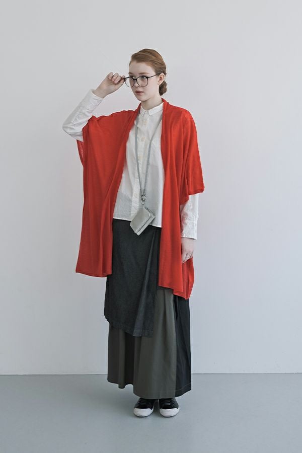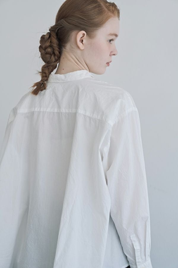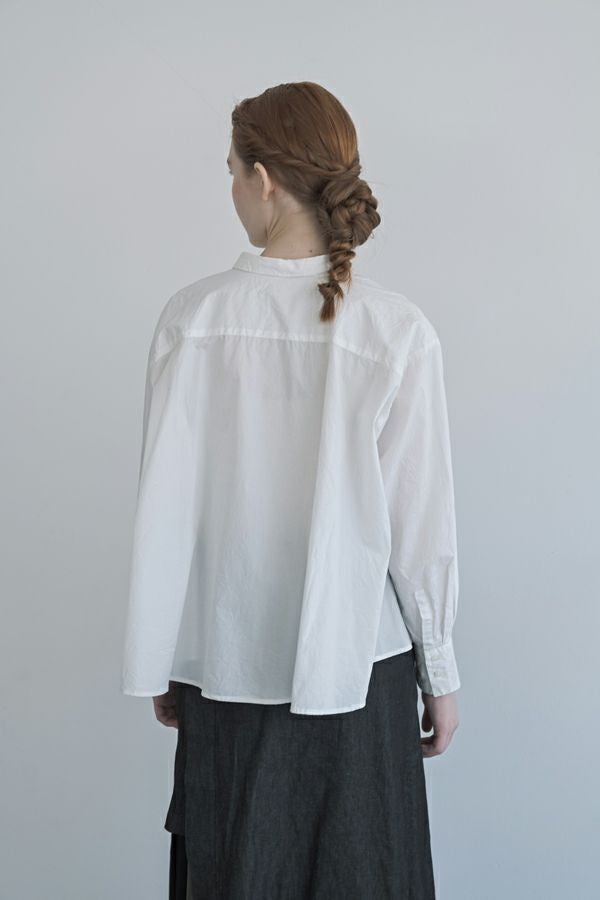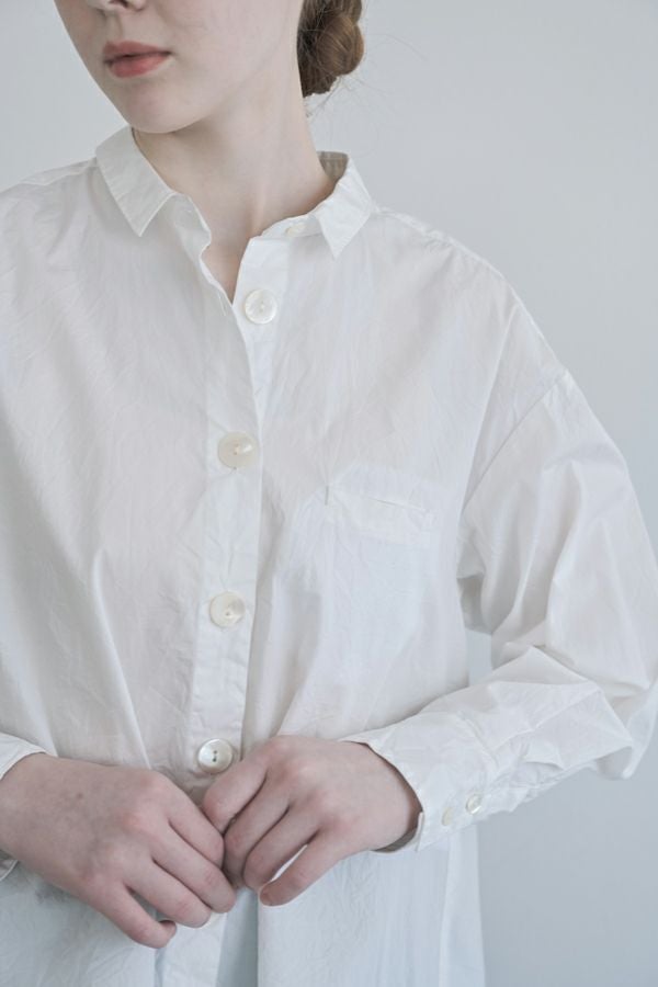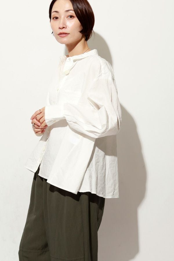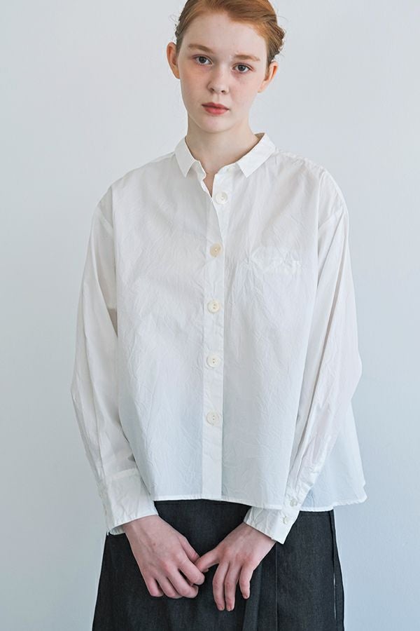 軽やか&立体シルエットが魅力、バックフレアシャツブラウス。 ワッシャー加工を施したバックフレアデザイン×チビ衿のシャツ。クロップド丈にすることで軽やかさをプラスし、甘すぎず洗練された立体感のある一枚に仕上げました。 前を閉じればコンパクトなシルエットでスマートに、フロントボタンを開ければ、軽やかな羽織りスタイルに。裾のたっぷりとした分量感が、気になるお腹周りを自然にカバーしてくれます。 ほどよいハリ感と軽やかな素材で、春・秋・冬と3シーズン活躍し、着回し自在。 リラックスボトムとの相性も抜群で、こなれたスタイルが完成します。 お客様の声から生まれた 左胸のアイディアポケット。(オリジナル札付き)暑い時にはアイスジェル(保冷剤)を入れて、快適に過ごせます。袋布には撥水布を使用し、溶けても安心です。