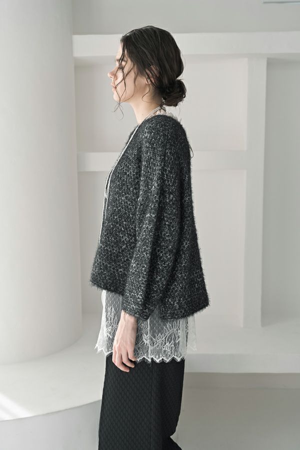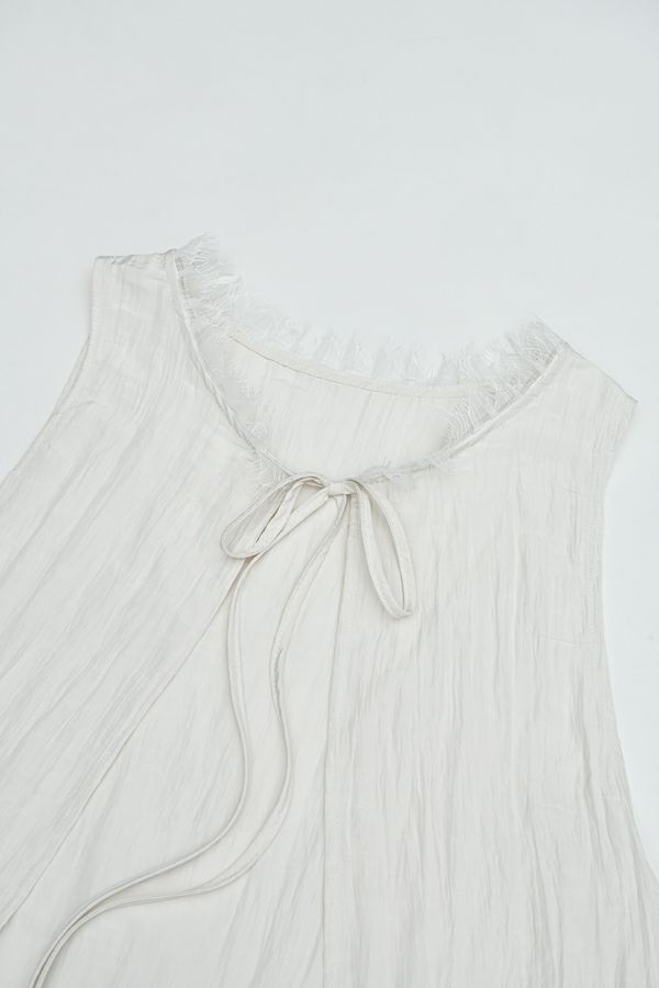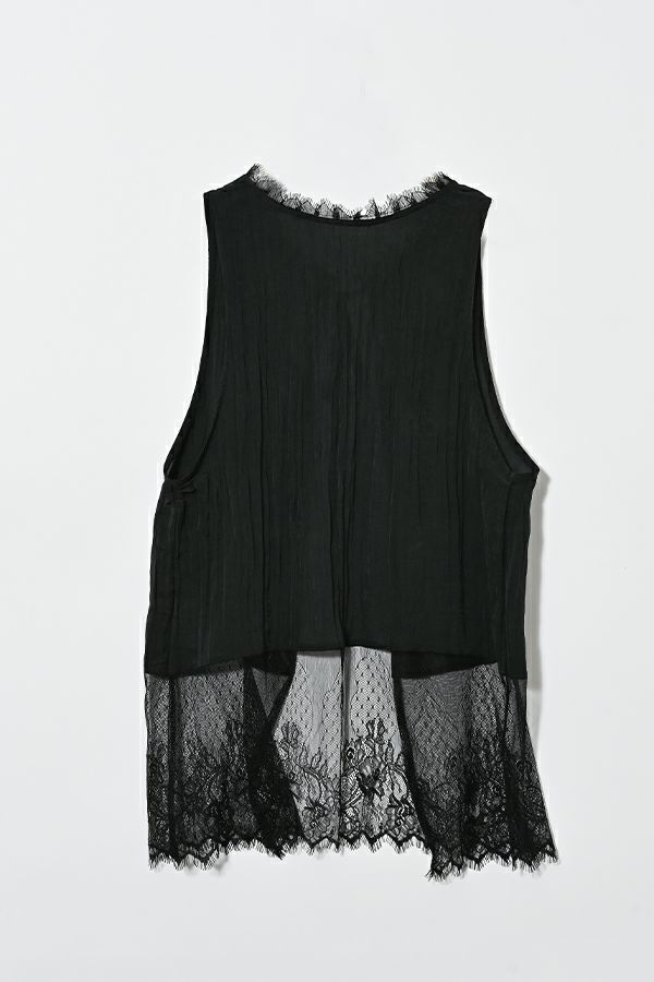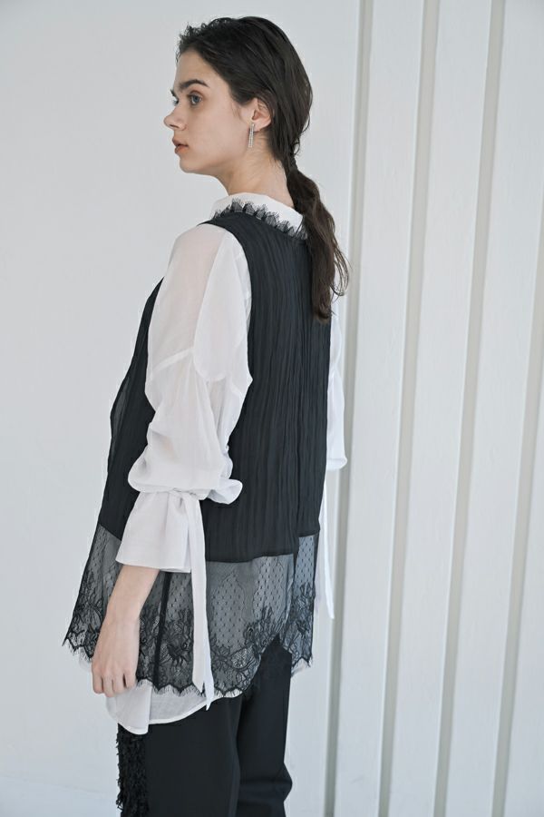 ヴィンテージライクな風合いが魅力、2WAYレースジレ。 マットサテンと繊細なレースの切り替えが、ランジェリーライクな上品さを演出。 衿ぐりにあしらったレースや、長めのリボンテープなど、細部までこだわりの詰まったデザインに仕上げました。 前後2wayで着用でき、リボンを後ろに持ってきてベストとしても活躍。レイヤードスタイルに取り入れるだけで、コーディネートにヴィンテージ感と女性らしいニュアンスをプラスしてくれる一着です。 薄手のロンTEE等のトップスにレイヤード。フェミニンな雰囲気を活かしつつ、デニムやチノパン、スラックスなどパンツスタイルと合わせることで、程よくカジュアルダウンした着こなしもおすすめです。
