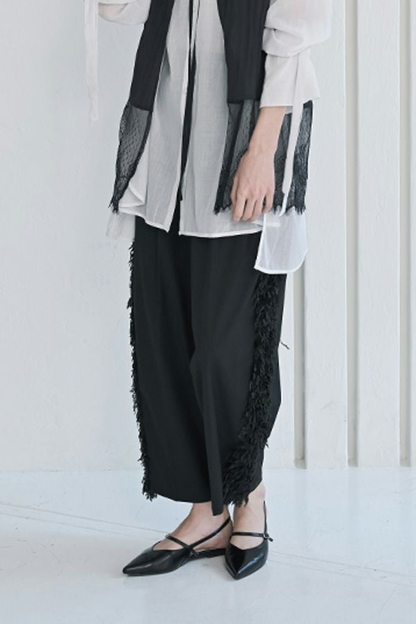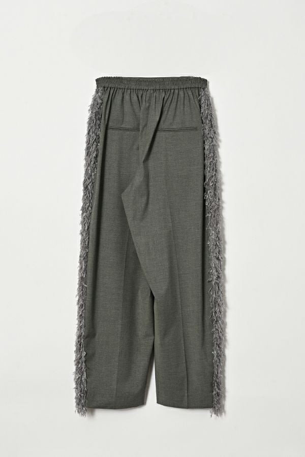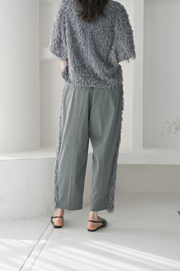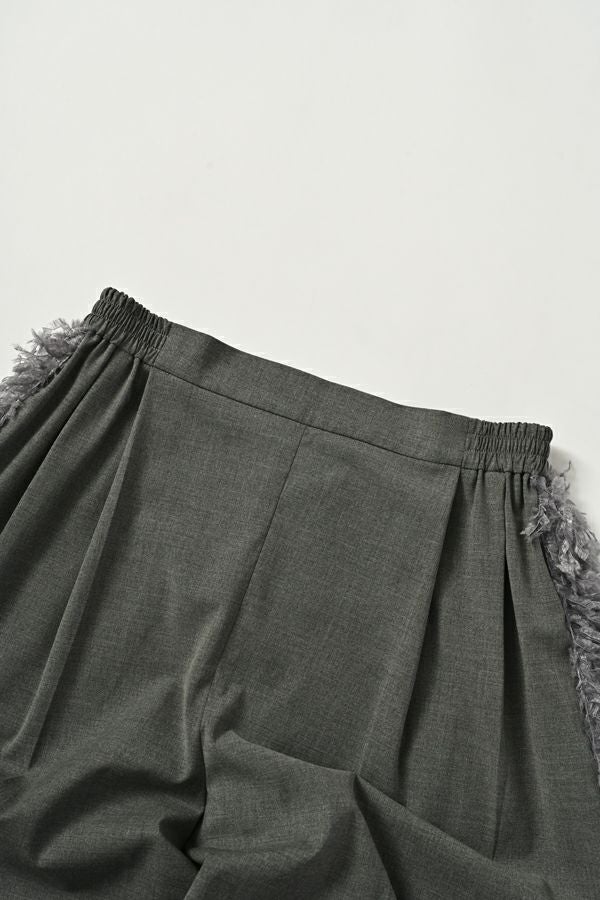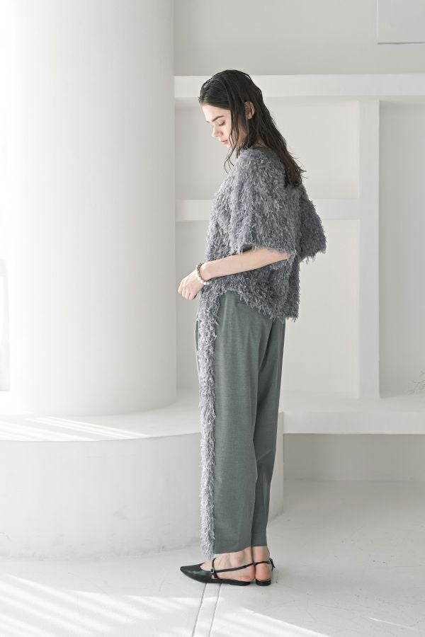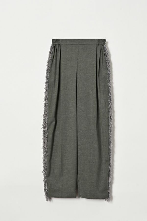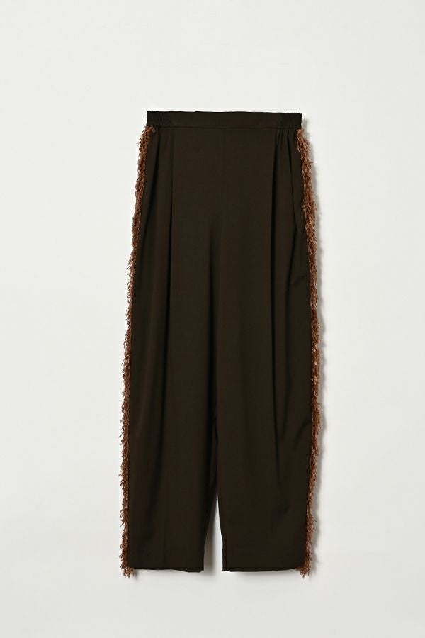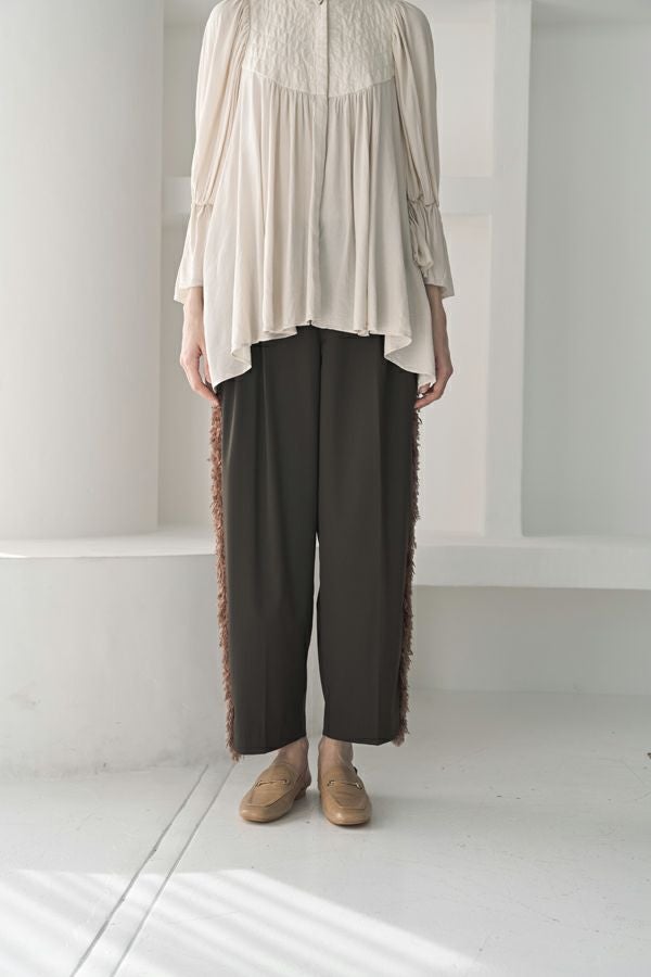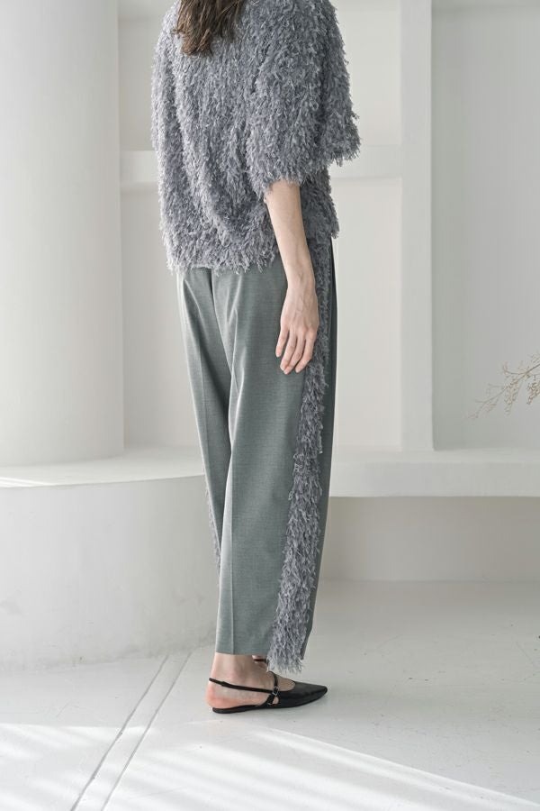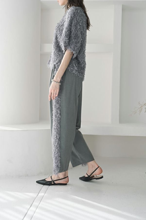 フェザーが揺れる、センシュアルなテーパードパンツ。 両サイドにあしらったフェザーが、動くたびに優雅な表情を生む一着。マニッシュな生地を贅沢に使用しながらも、リラックス感のあるテーパードシルエットが大人のフェミニティを演出します。 ウエストには大きめの2タックを施し、後ろゴム仕様でストレスフリーな履き心地に。 オケージョンシーンでは、同素材のプルオーバー(25228-1413D-G)とセットアップで華やかな印象に。クリーンなシャツスタイルはもちろん、Tシャツやスウェットと合わせてカジュアルダウンするのもおすすめ。 トップスを選ばず、幅広いスタイリングにマッチする万能パンツです。