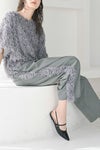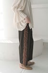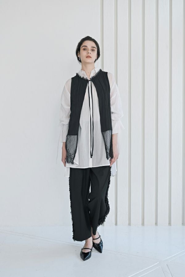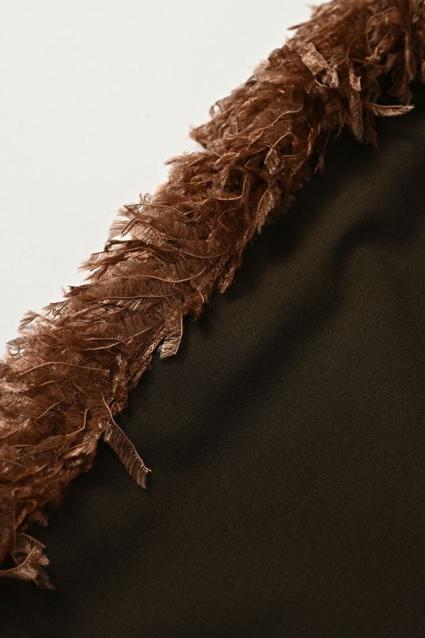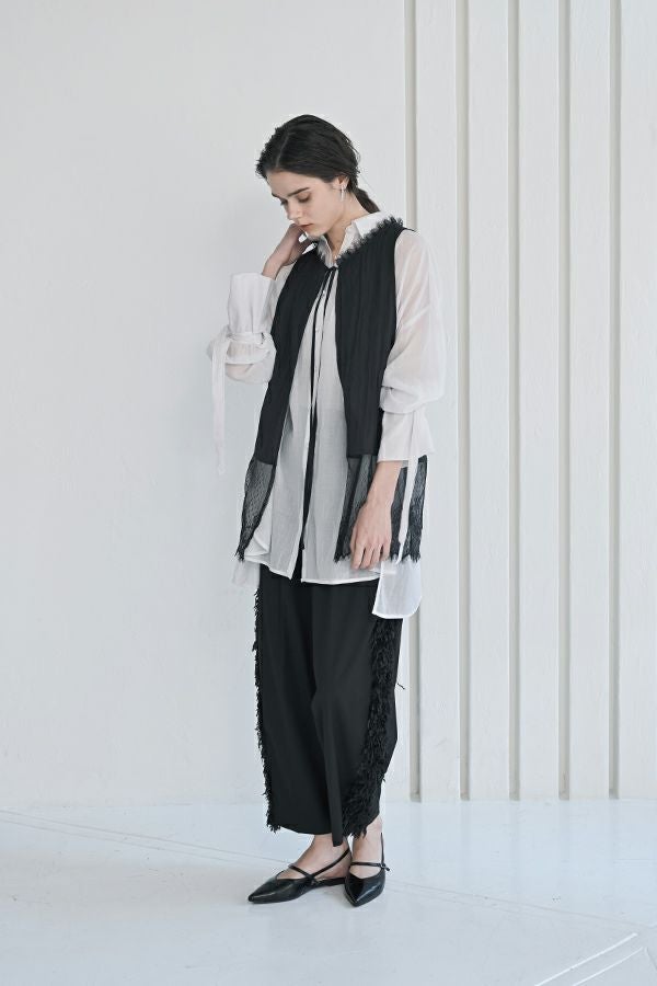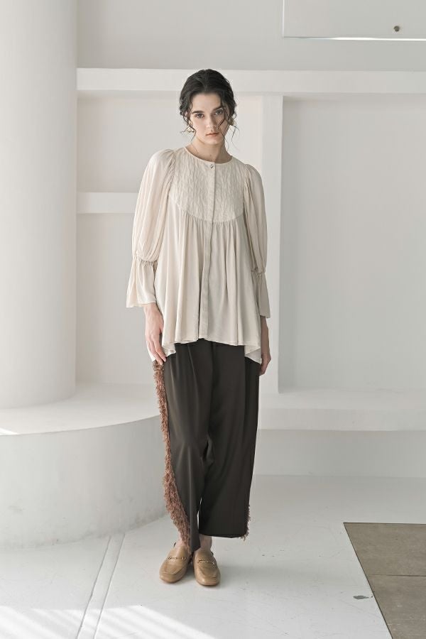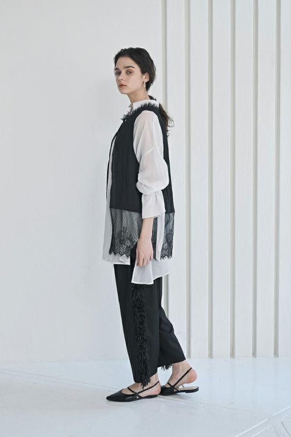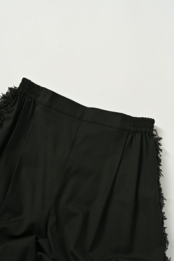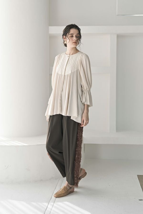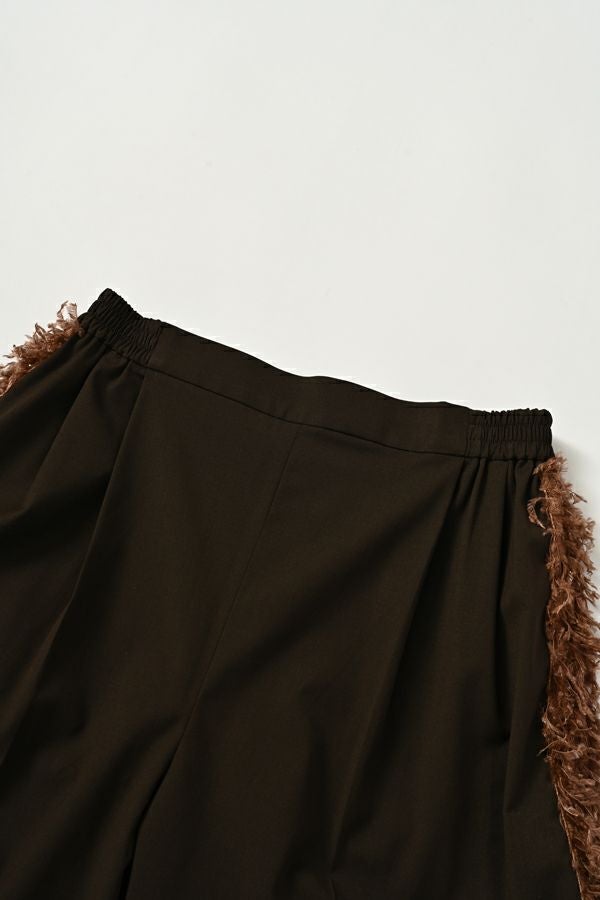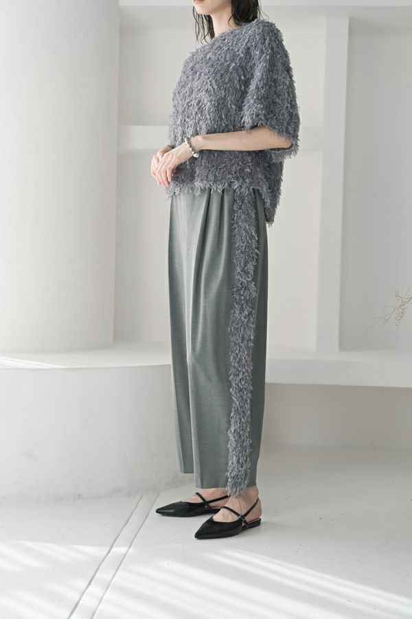 フェザーが揺れる、センシュアルなテーパードパンツ。 両サイドにあしらったフェザーが、動くたびに優雅な表情を生む一着。マニッシュな生地を贅沢に使用しながらも、リラックス感のあるテーパードシルエットが大人のフェミニティを演出します。 ウエストには大きめの2タックを施し、後ろゴム仕様でストレスフリーな履き心地に。 オケージョンシーンでは、同素材のプルオーバー(25228-1413D-G)とセットアップで華やかな印象に。クリーンなシャツスタイルはもちろん、Tシャツやスウェットと合わせてカジュアルダウンするのもおすすめ。 トップスを選ばず、幅広いスタイリングにマッチする万能パンツです。