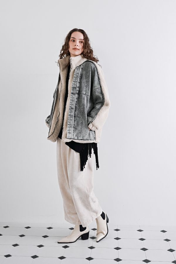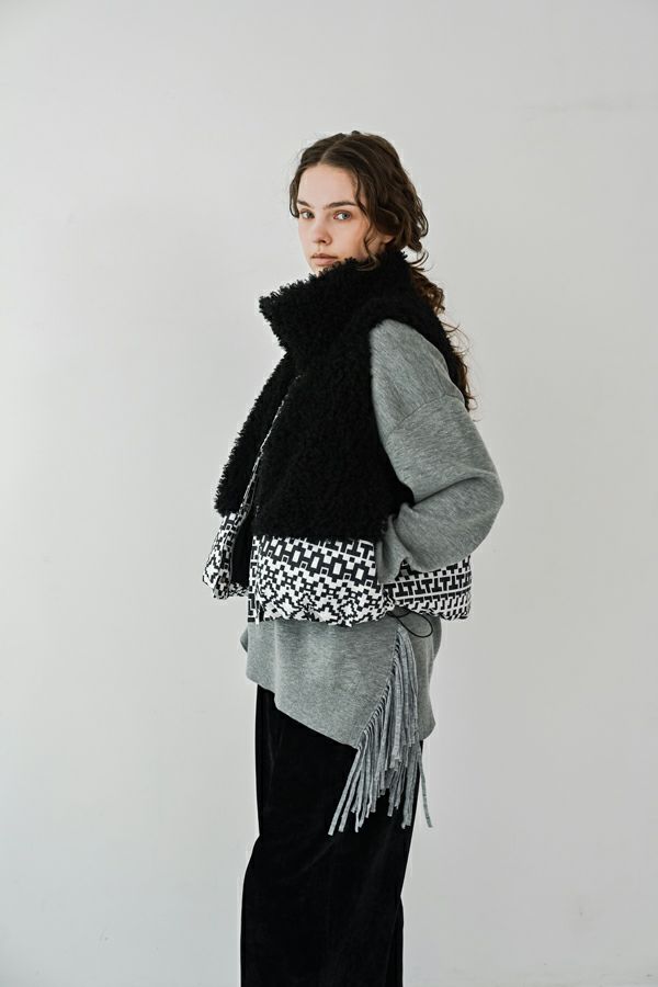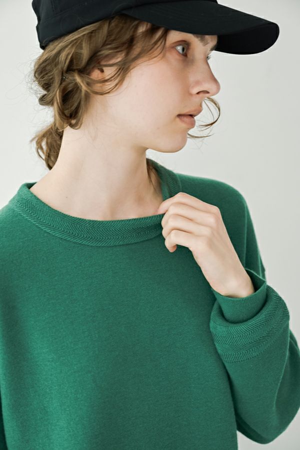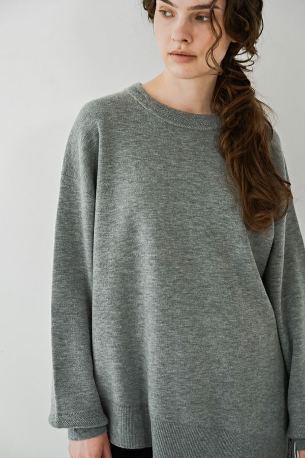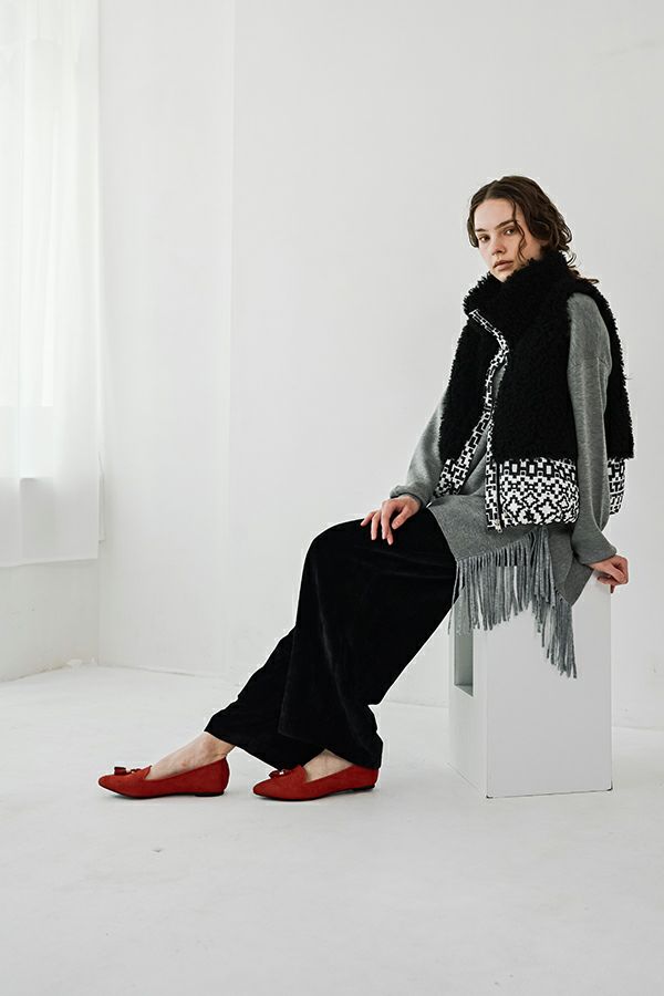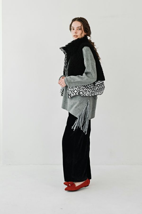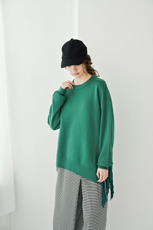 緻密な編地と計算美、纏うだけで品格が宿るニットプルオーバー。 柔らかな肌触りの身頃はスムース編みでスウェットライクなリラックス感がありながらもきれいめな印象に、衿と袖はニットの緻密な柄編みを施して洗練されたデザインに仕上げています。 一見ミニマルながら、計算しつくされたシルエットが特徴です。アシメトリーのカーブ裾ライン、左脇に深めのスリット、そして圧縮ウール糸であしらったテープフリンジまで着用時のスタイルを美しく魅せるデザインに。 一枚着でサマになるので、シンプルデザインのボトム合わせで大人の洗練されたスタイリングが叶う優秀ニットです。