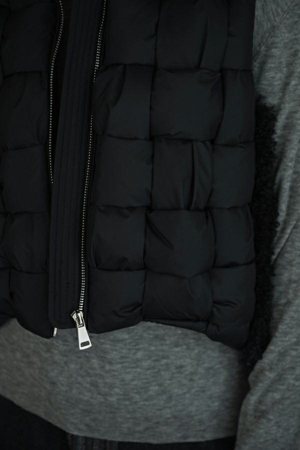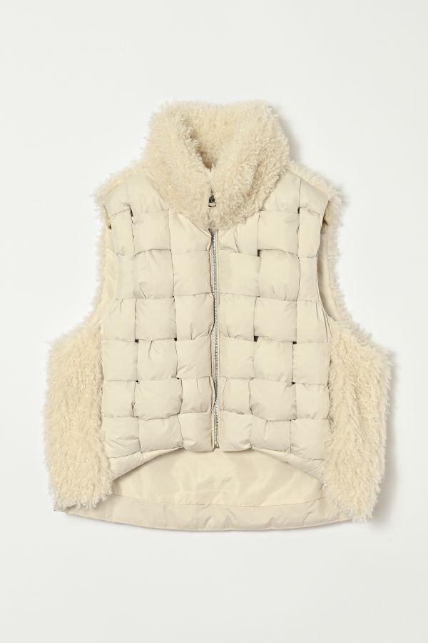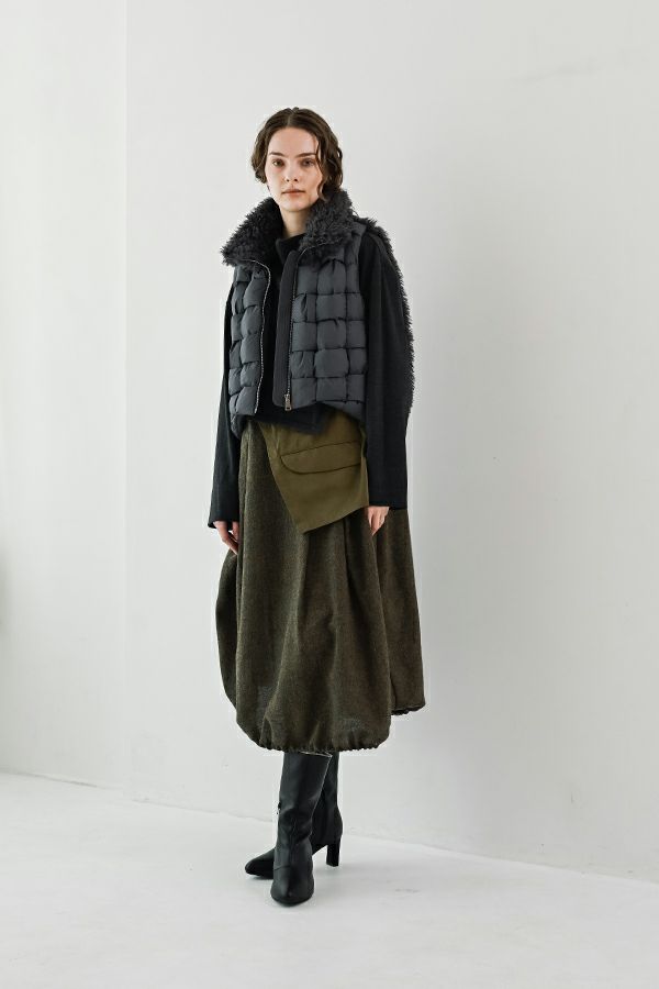 異素材が奏でる、洗練と存在感。大人のためのハンサムベスト。 シンプルなシルエットの中に、モードな要素を巧みに散りばめた一着。前身頃にはパディッド(中綿入り)テープを編み込んだ立体的なディテールに。衿と後ろ身頃にはカルガンラム風の柔らかなフェイクファーを使用し、リュクスなムードを演出。 裾部分には中綿入りのポリエステルヨークを配し、ヒップラインを包み込むような設計に。 軽さと温もりを備えた異素材のコントラストが、装いに奥行きをもたらします。ショート丈がスタイルアップ効果を発揮し、甘さを抑えたファー使いで、媚びない女性らしさを表現。 華やかさとクールさを絶妙に併せ持つ、大人のためのハンサムモードベストです。