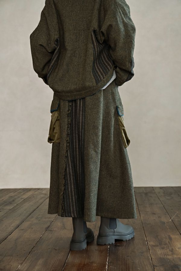静かに惹きつける、縦ラインの魔法。立体感で魅せるモードスカート。 ストライプとバーズアイ風ツイードを縦に切り替えた配色が、視覚的な細見え効果を演出し、すっきりとした印象に。ナイロン素材のBIGポケットはヒップまわりをさりげなくカバーしながら、モードな存在感を添えます。 メロウなロング丈のシルエットは、裾の分量を巧みに調整することで軽やかな揺れ感を実現。歩くたびに表情が生まれ、足さばきも快適です。しわになりにくいツイード素材で、シーズンレスに着回せるのも魅力。 機能美とエレガンスを兼ね備えた、大人のための一着です。 ●ツイードナイロンジャケット(25238-6634P-W)とセットアップ可