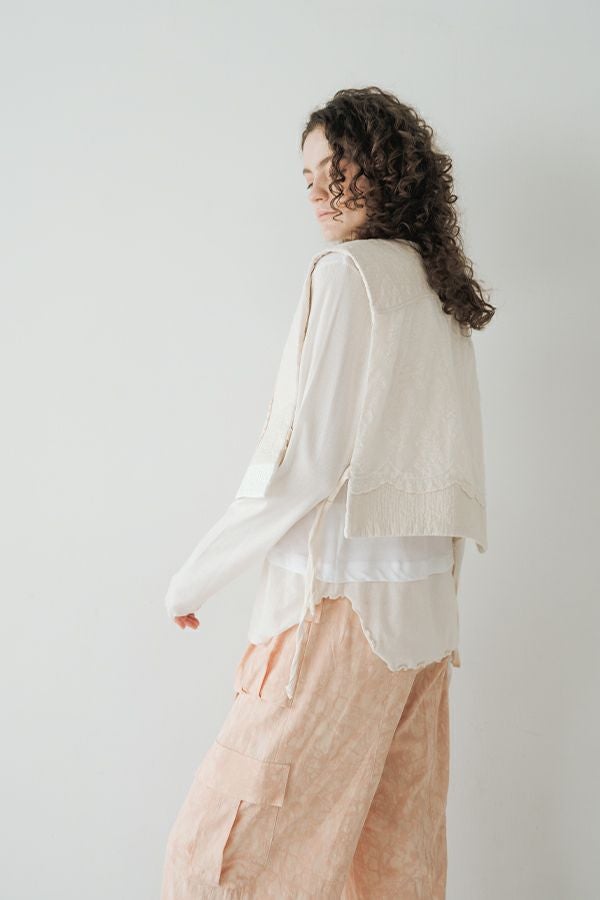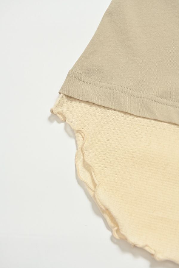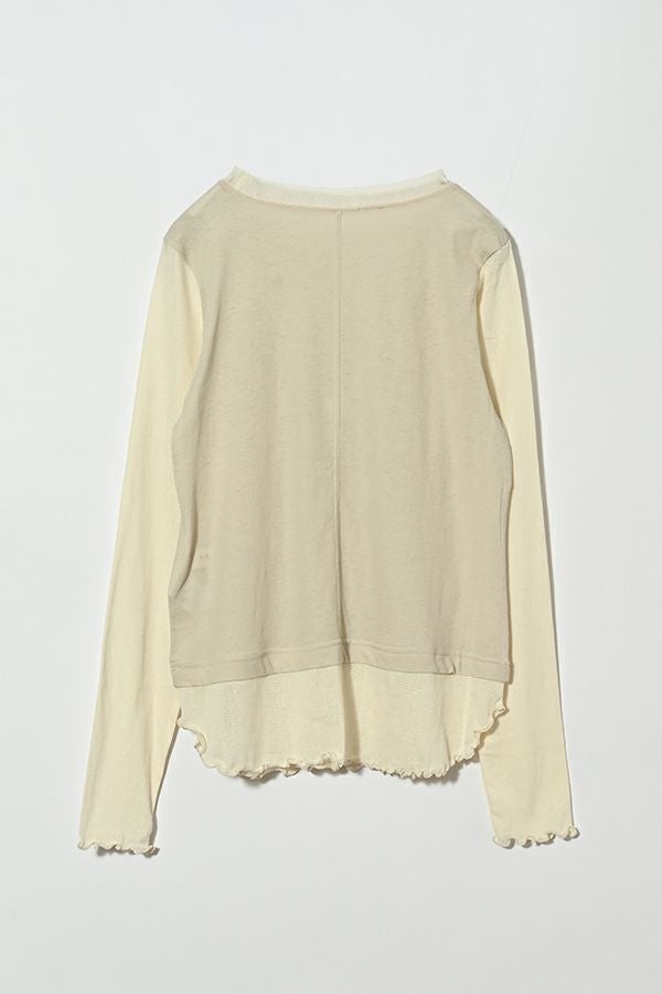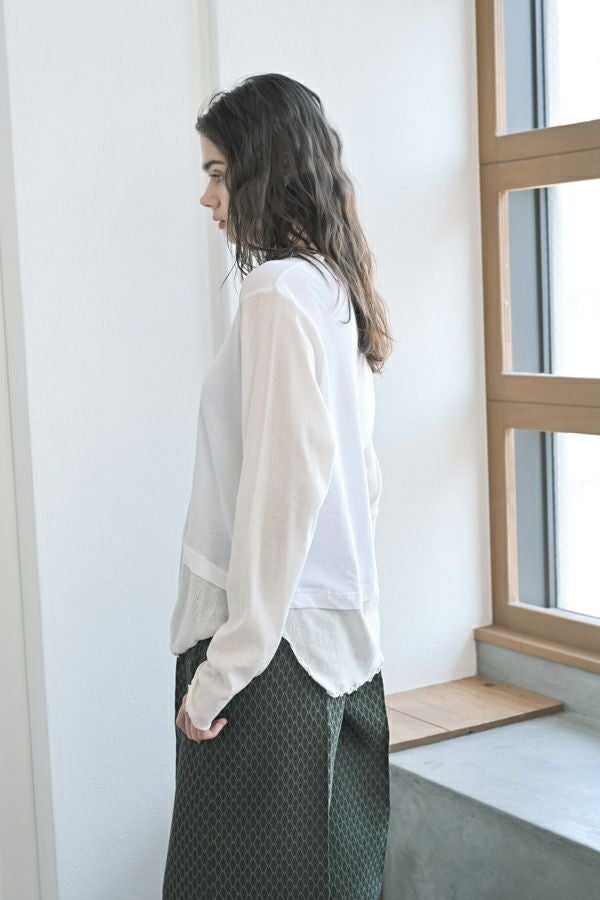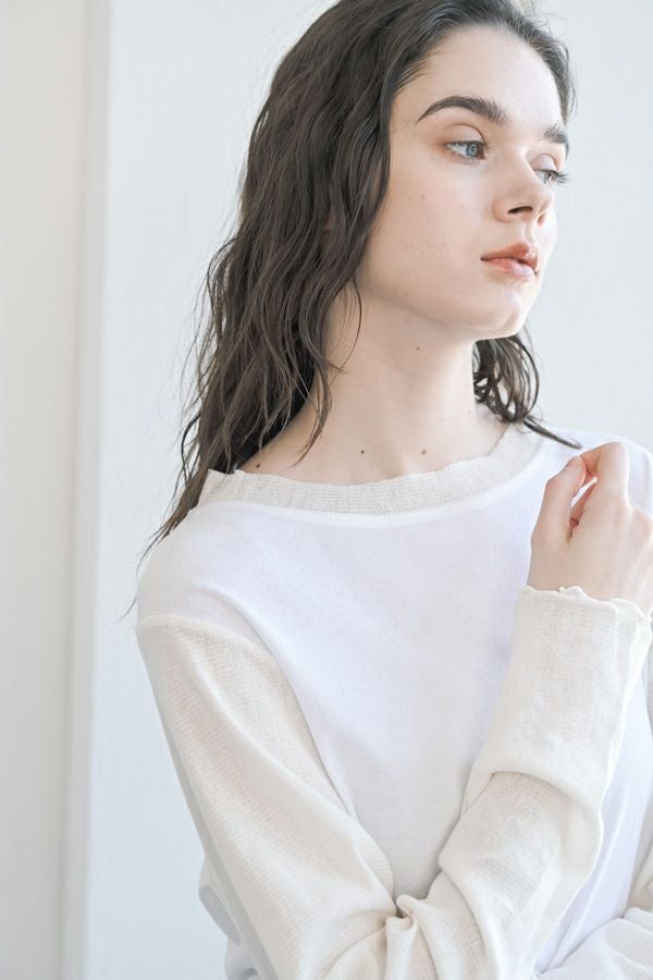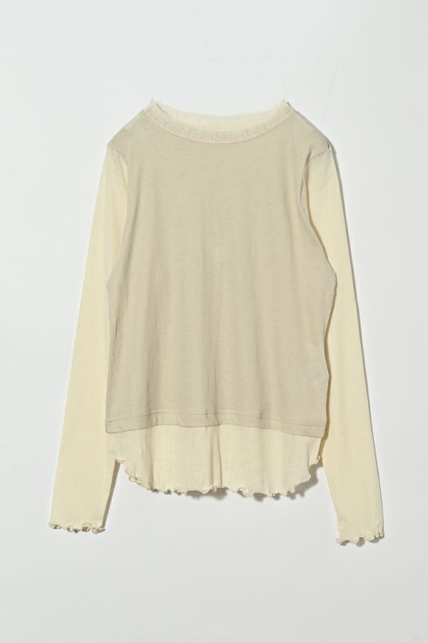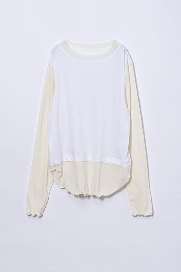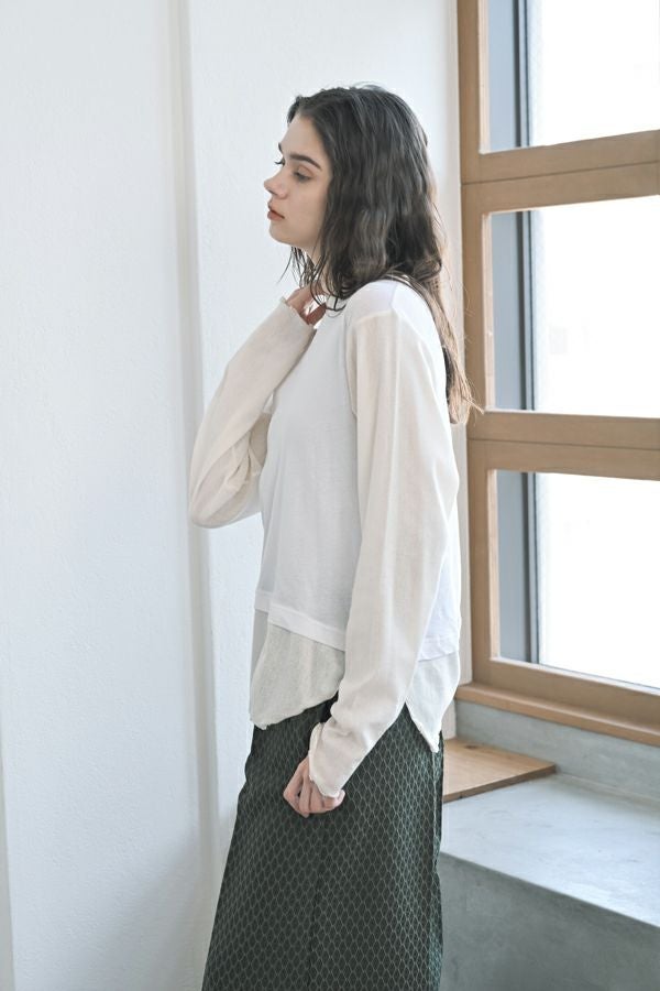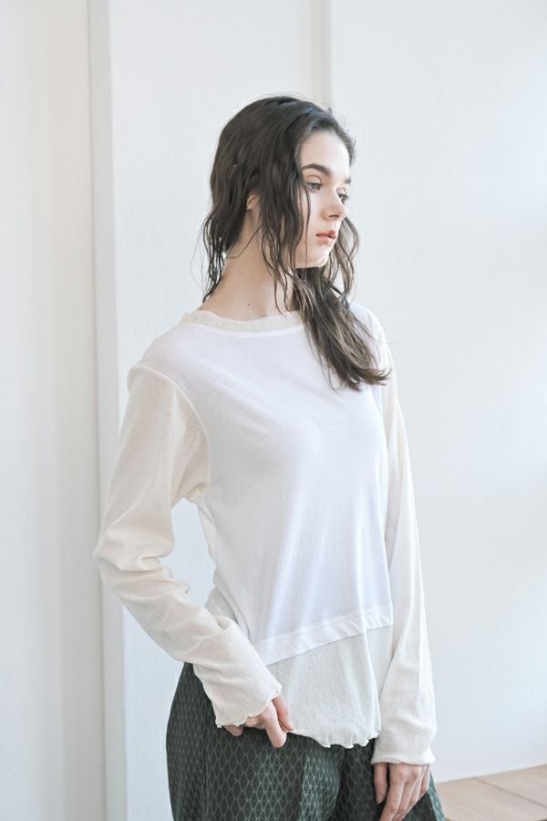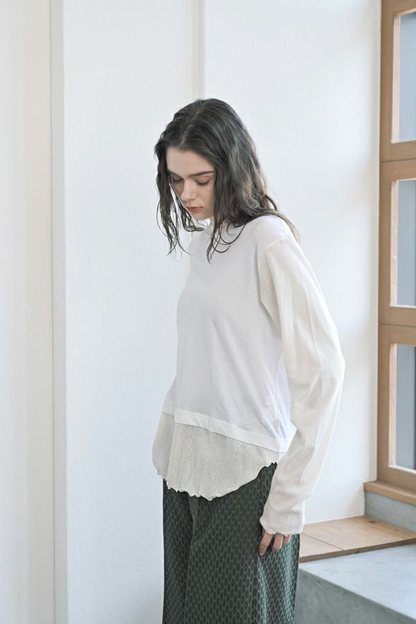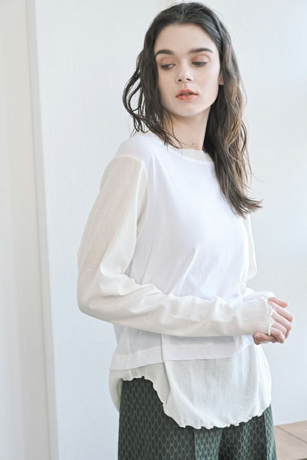 大人女子が求めていた、レイヤード風カットソープルオーバー。 程よいあきのクルーネックは、メッシュ切替とカットオフで軽やかな首元に。袖口と裾はメロウ仕上げで、動きを出して。袖と裾はメッシュ素材を切替えてレイヤード見えに。オシャレに差がつく数センチ。スタイルアップ見せ効果も期待。シンプルながらも存在感があります。 1枚で着用の際にもラウンドヘム(裾)のシルエットでウエスト周りはスッキリな印象に。 透け感のある女性らしいアイテムなので、ボリュームのあるワイドパンツを合わせるとメリハリのあるスタイリングになります。デニムやカーゴパンツと合わせて、大人のカジュアルコーデにも◎