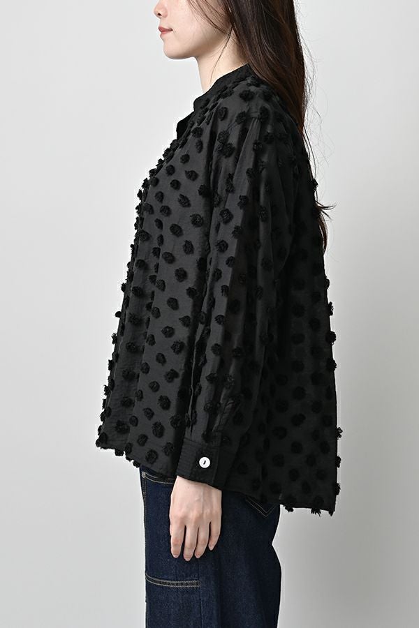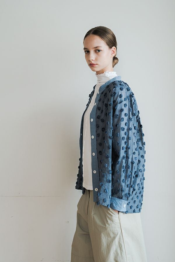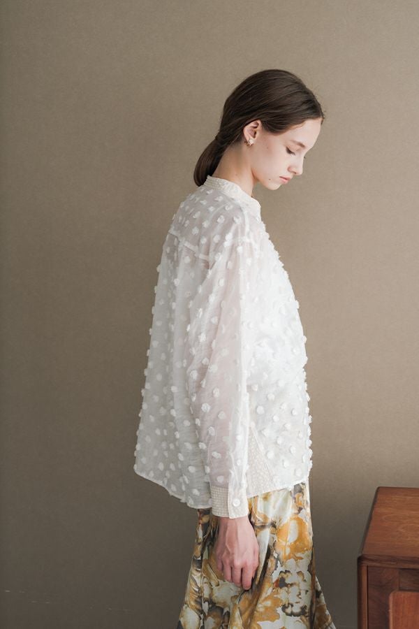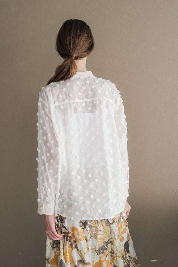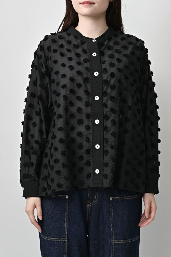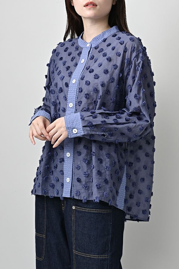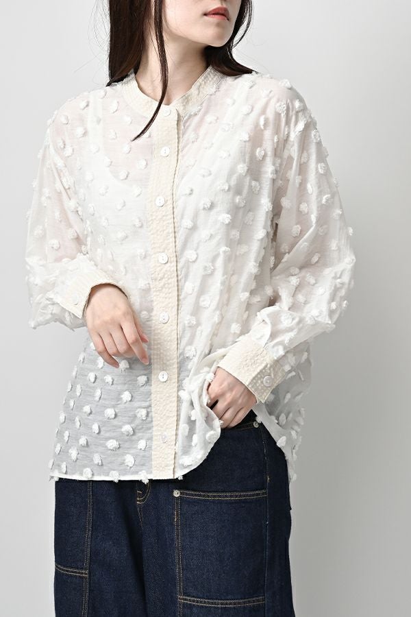 透け感を纏う、ポンポンボイルの軽やかブラウス。 小さなマリモのようなポンポンが散りばめられた、立体感のあるコットンボイル素材。ふんわりと透ける軽やかさと、どこか愛らしい素材感が魅力です。 パリッとしたハリと自然なシボ感をもつサッカー素材を組み合わせることで、甘さを抑えた大人のバランスに。 細めのスタンドカラーから続くVネックラインは、程よい抜け感と女性らしさを演出します。後ろにタックを取ったゆるやかなシルエットで、ふんわりと風をはらむような着心地。羽織りとしても楽しめ、盛夏まで活躍する一枚です。 キャミソールを合わせて透け感を楽しむスタイルもおすすめ。カジュアルにもきれいめにも寄り添う、大人の遊び心を感じさせるブラウスです。 ●手洗い可