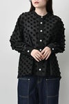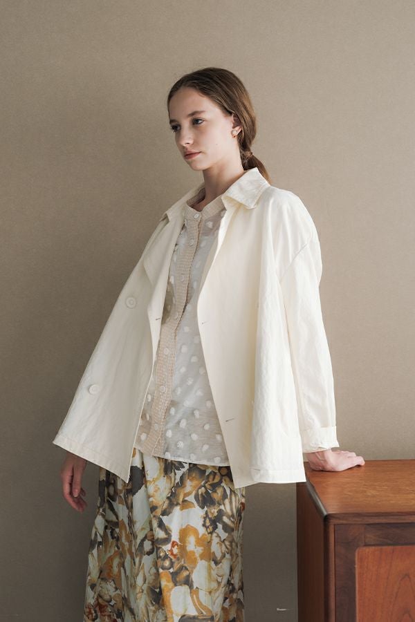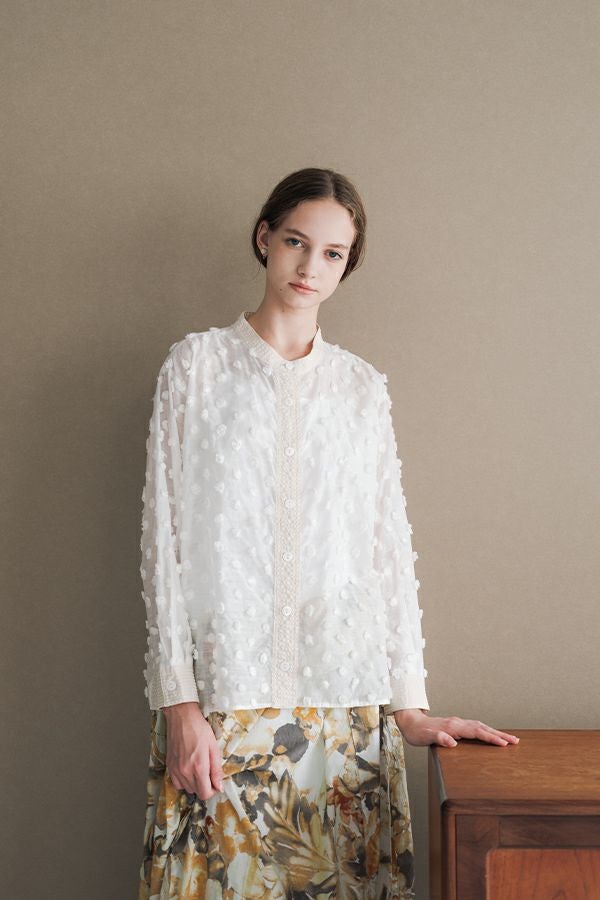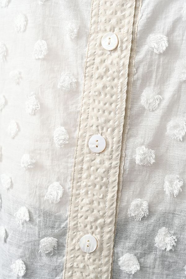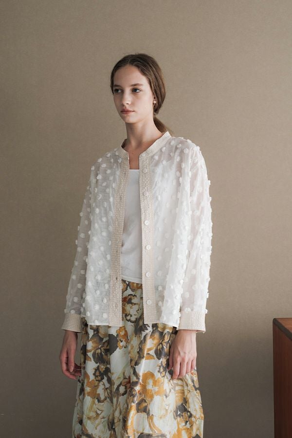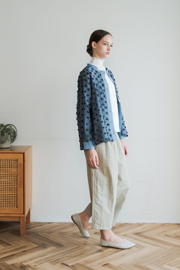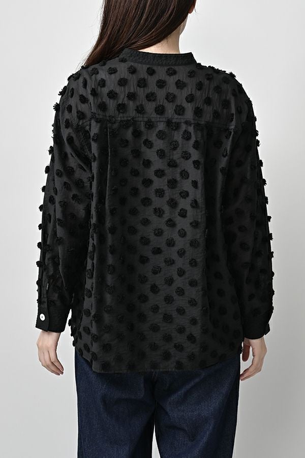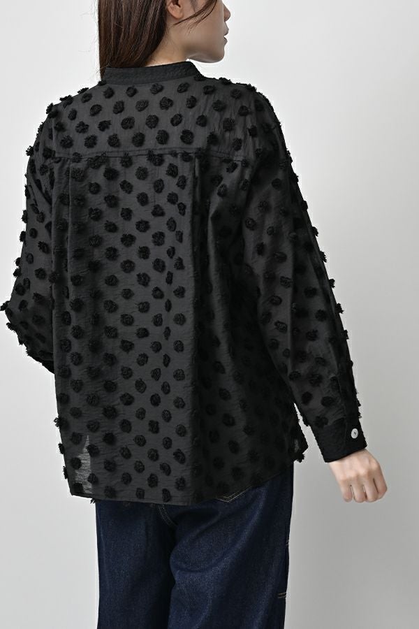 透け感を纏う、ポンポンボイルの軽やかブラウス。 小さなマリモのようなポンポンが散りばめられた、立体感のあるコットンボイル素材。ふんわりと透ける軽やかさと、どこか愛らしい素材感が魅力です。 パリッとしたハリと自然なシボ感をもつサッカー素材を組み合わせることで、甘さを抑えた大人のバランスに。 細めのスタンドカラーから続くVネックラインは、程よい抜け感と女性らしさを演出します。後ろにタックを取ったゆるやかなシルエットで、ふんわりと風をはらむような着心地。羽織りとしても楽しめ、盛夏まで活躍する一枚です。 キャミソールを合わせて透け感を楽しむスタイルもおすすめ。カジュアルにもきれいめにも寄り添う、大人の遊び心を感じさせるブラウスです。 ●手洗い可