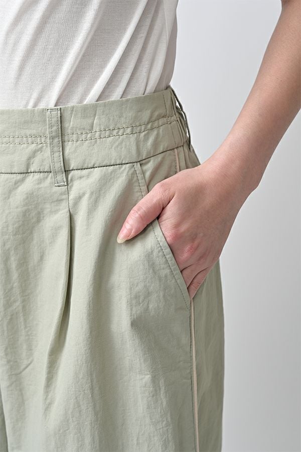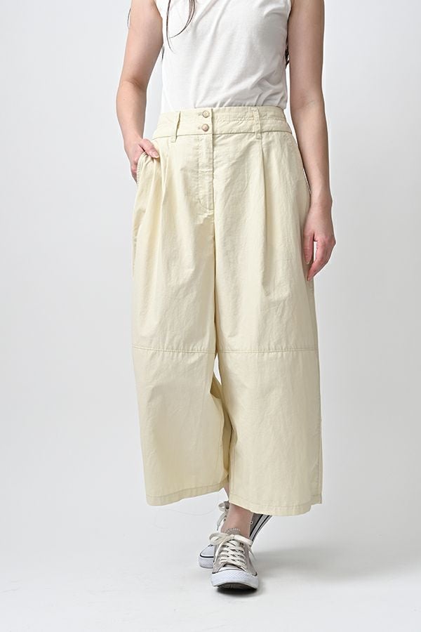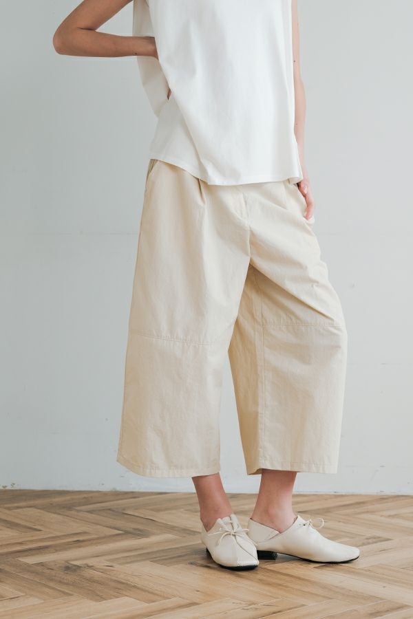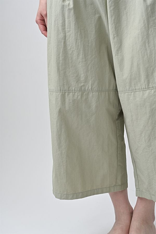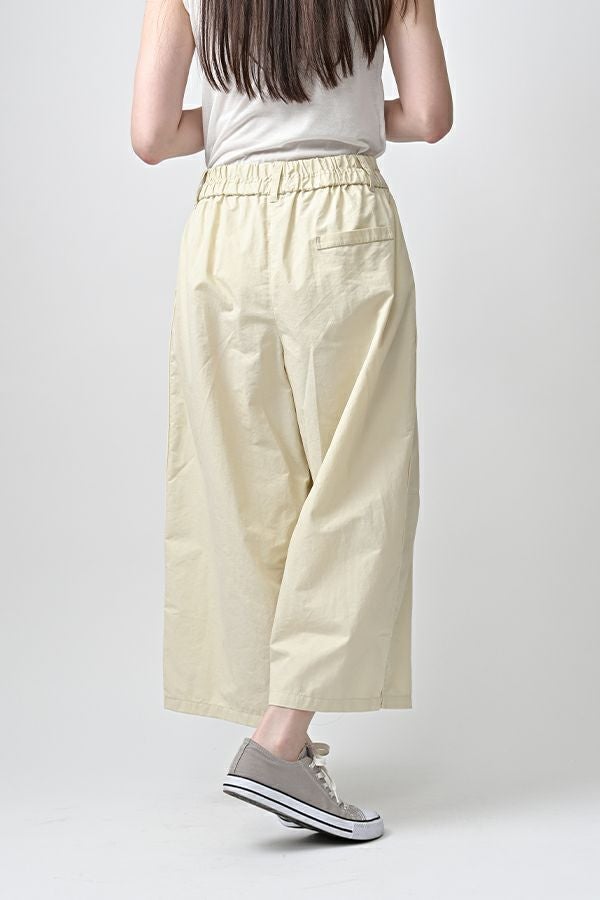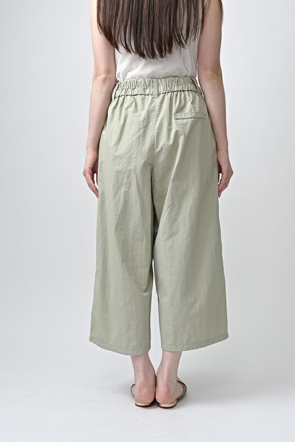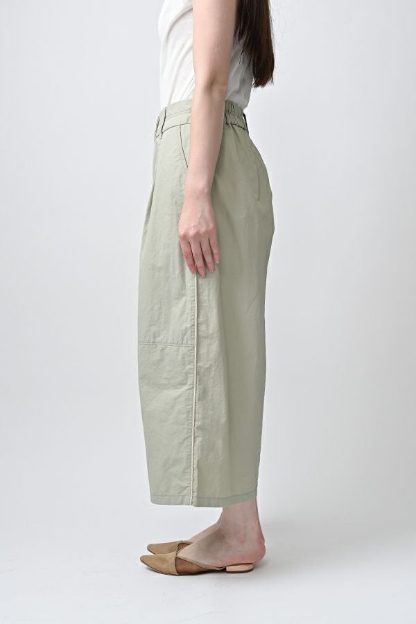 ハリと丸みが描く、ストレスフリーな美シルエットコクーンパンツ。 サラッとした細番手コットンに麻糸と光沢のあるナイロンを織り交ぜた素材。 ほどよいハリとふくらみがあり、シワになりにくく、美しい落ち感が魅力です。 akaneらしい丸みのあるカーブシルエットのコクーンパンツは、前身頃中央に接ぎを入れることで立体的なフォルムを表現。前開きの太めウエストベルトにはダブルステッチのアクセントを施し、後ろウエストはゴム仕様で体にフィットしながら快適な動きやすさを実現しました。 深めのフロントタックが腰周りに立体感を生み、太ももまでゆったりとしたストレスフリーな着心地。ショート丈やクロップド丈のカットソー、シャツなどのトップスとの相性もよく、足元はソックス+スニーカーでアクティブに楽しめます。