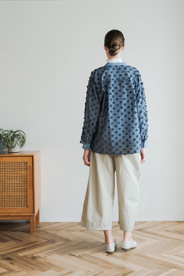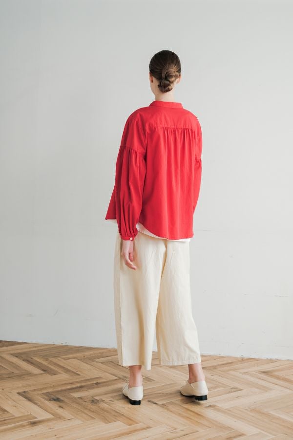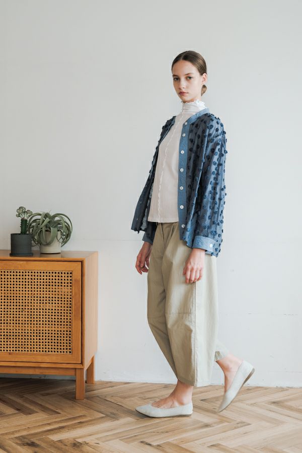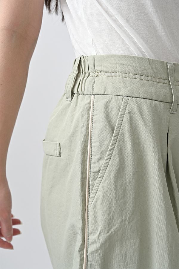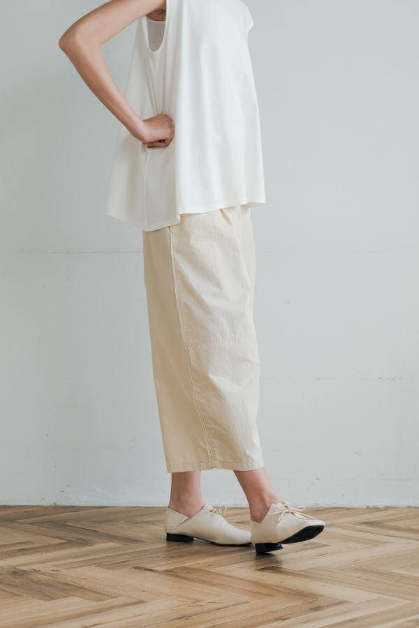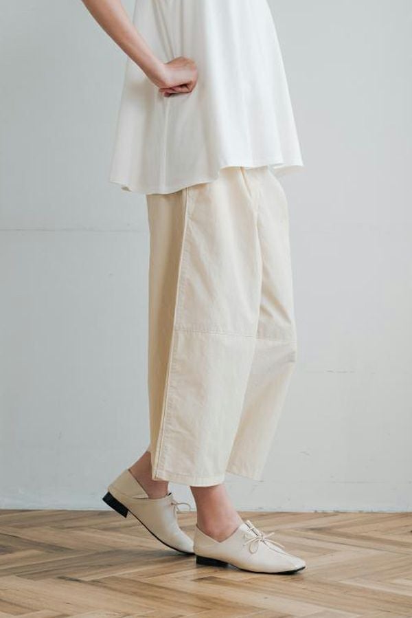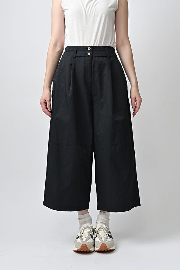 ハリと丸みが描く、ストレスフリーな美シルエットコクーンパンツ。 サラッとした細番手コットンに麻糸と光沢のあるナイロンを織り交ぜた素材。 ほどよいハリとふくらみがあり、シワになりにくく、美しい落ち感が魅力です。 akaneらしい丸みのあるカーブシルエットのコクーンパンツは、前身頃中央に接ぎを入れることで立体的なフォルムを表現。前開きの太めウエストベルトにはダブルステッチのアクセントを施し、後ろウエストはゴム仕様で体にフィットしながら快適な動きやすさを実現しました。 深めのフロントタックが腰周りに立体感を生み、太ももまでゆったりとしたストレスフリーな着心地。ショート丈やクロップド丈のカットソー、シャツなどのトップスとの相性もよく、足元はソックス+スニーカーでアクティブに楽しめます。