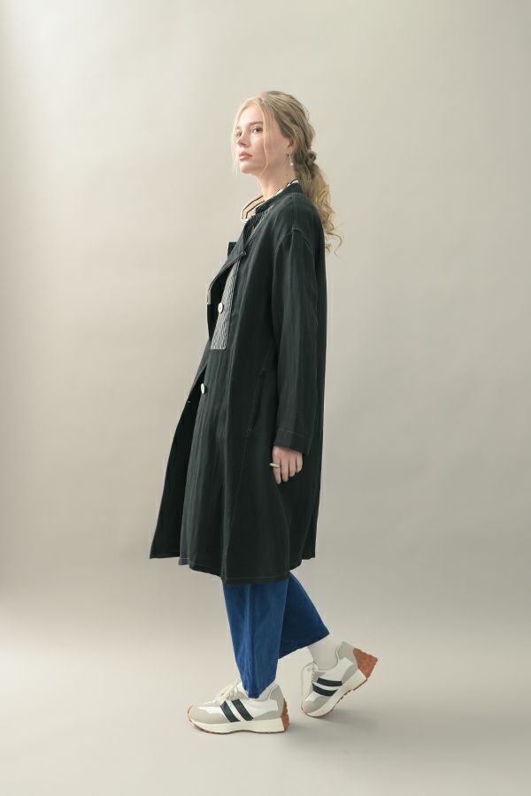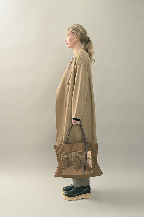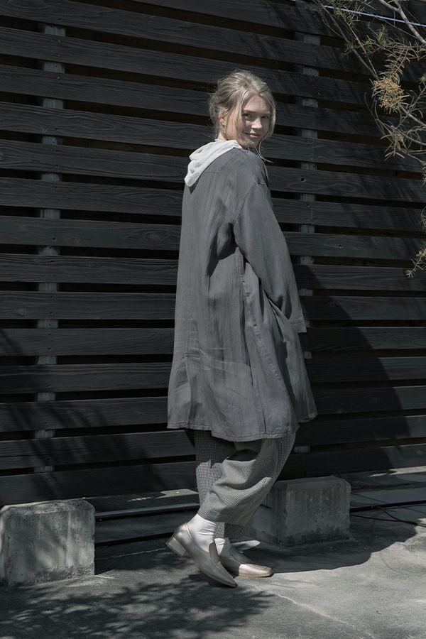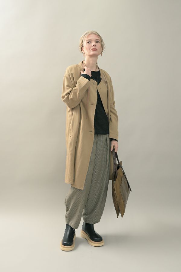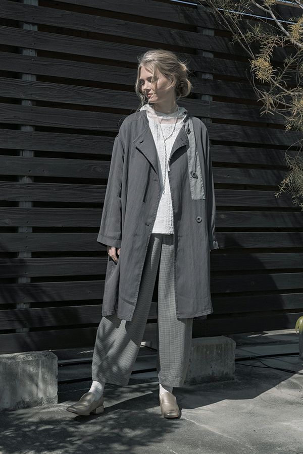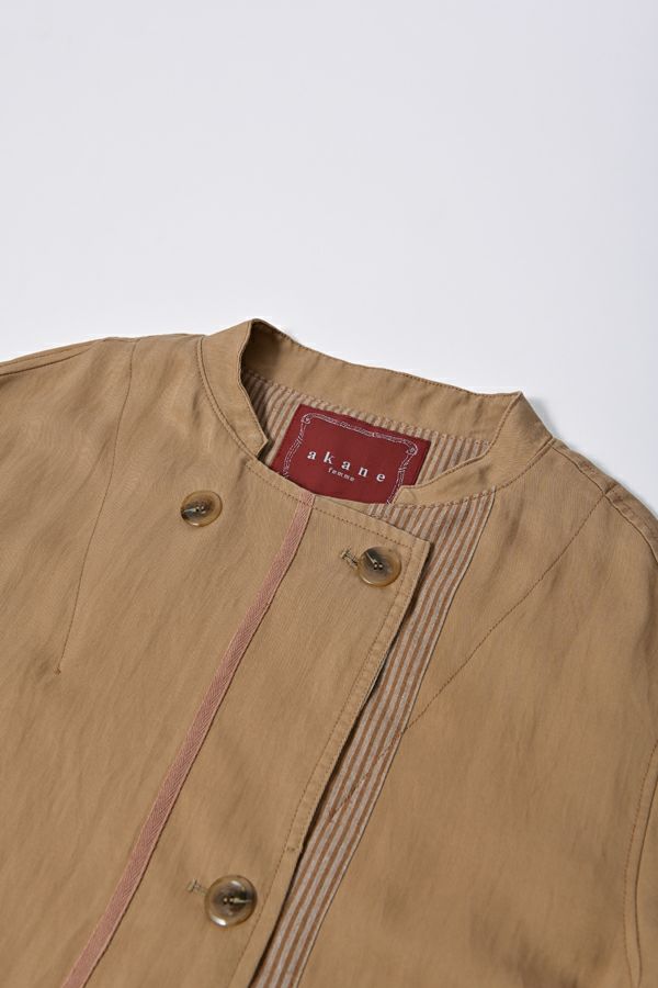 配色テープがアクセントとなり、カッコ良さと女性らしさが絶妙のバランスに仕上がっています。衿と後ろ切替に入っているドローコード(金具付きのヒモ)でギャザーを入れ、立体的な動きのあるシルエットにも調整可能です。