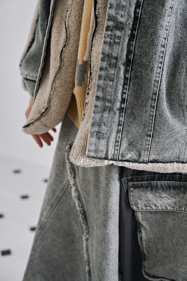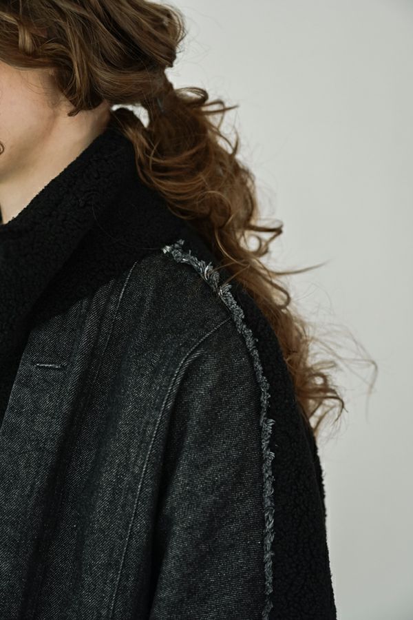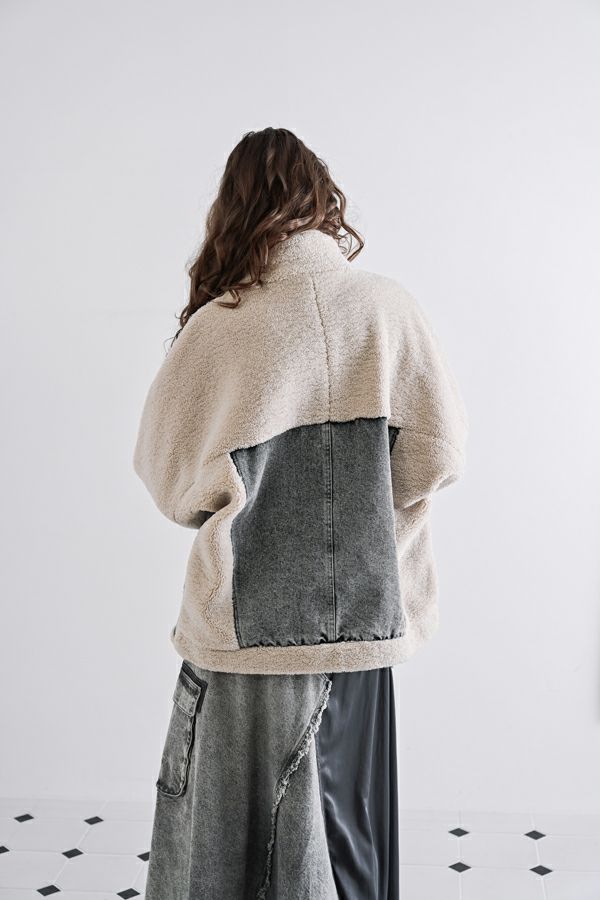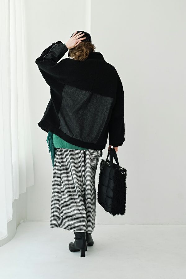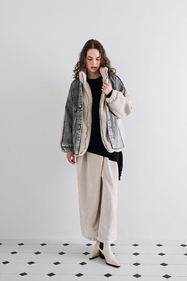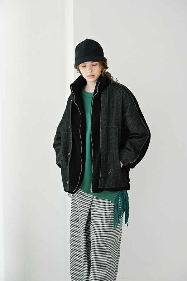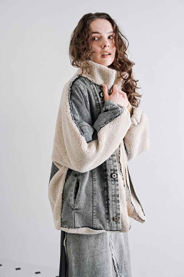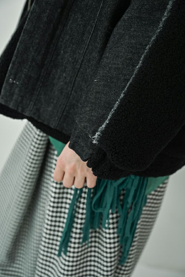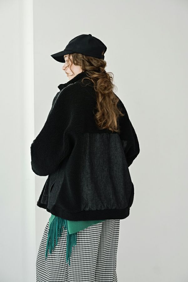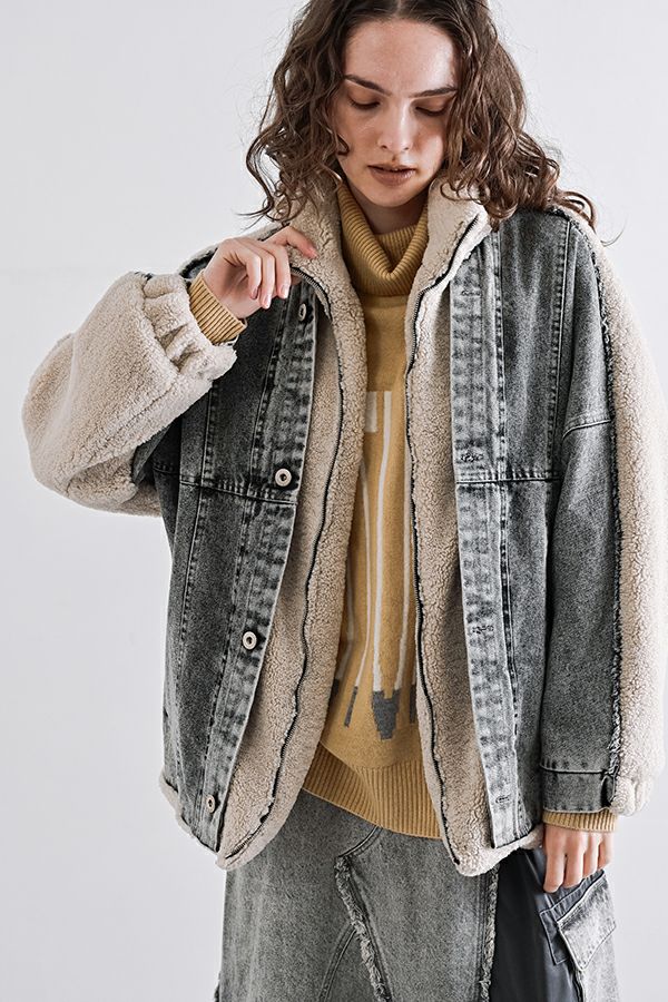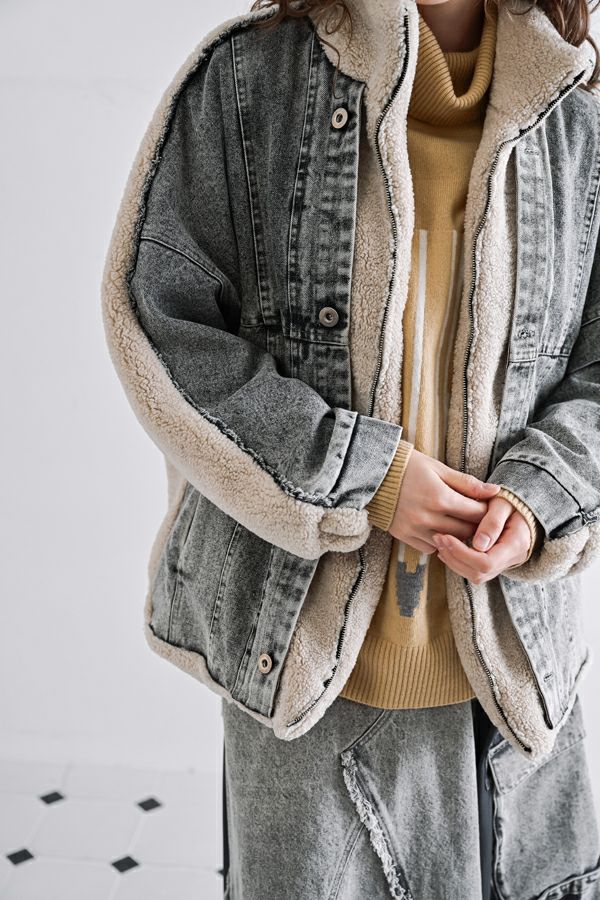 ラフさに宿る、洗練の余裕。異素材で魅せる大人カジュアルなジャケット。 ケミカルデニムとアンティーク調のボアを掛け合わせた、表情豊かな異素材コンビ。後ろ身頃はあえて重くなりすぎないよう、中心にデニムを切り替え、軽やかな動きと奥行きをプラス。ヒップが隠れる長めの丈感で、抜け感と安心感を両立させました。 フロントはファスナーを閉めずに、タック釦だけで留めるスタイルもおすすめ。 ゆったりとしたサイズ感と暖かく包み込むボアの風合いが、大人のアクティブカジュアルを惹き立てます。ほどよいラフさとモード感が交差する、デイリーに頼れる洗練ジャケットです。 ●デニムスカート(25238-8090P-W)とセットアップ可
