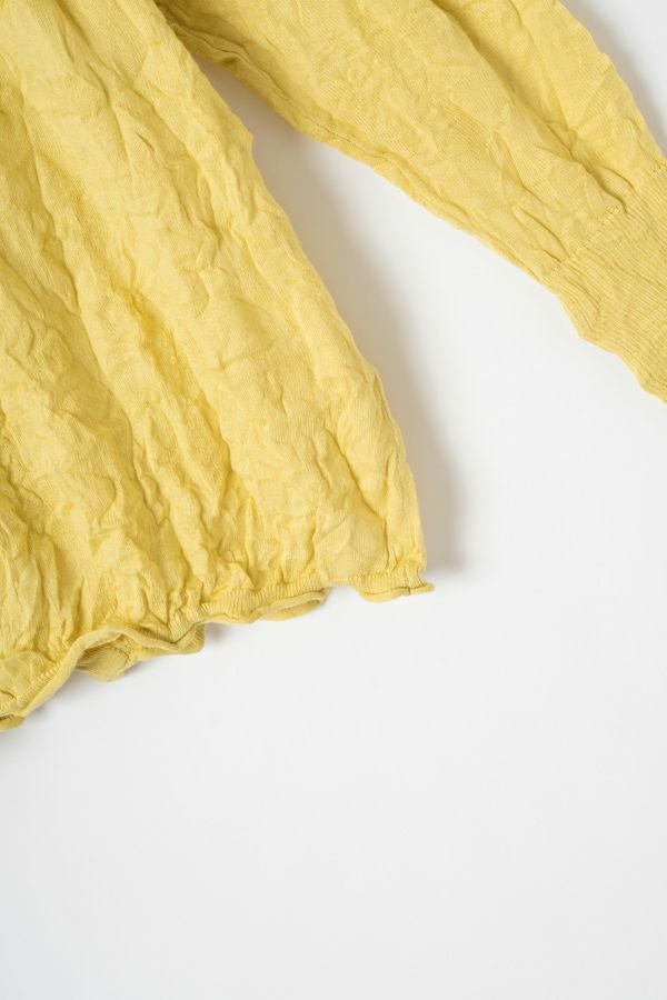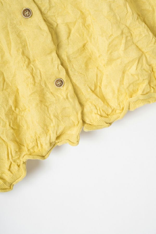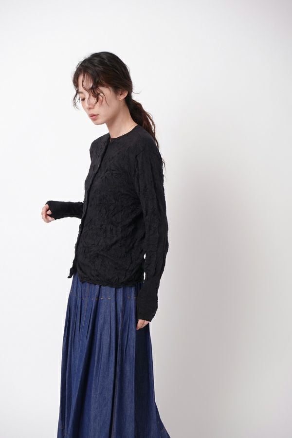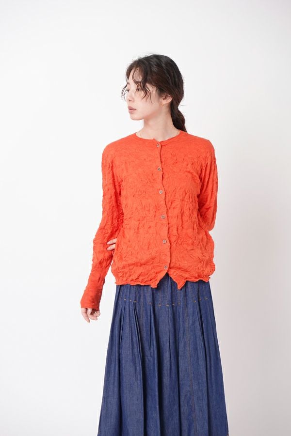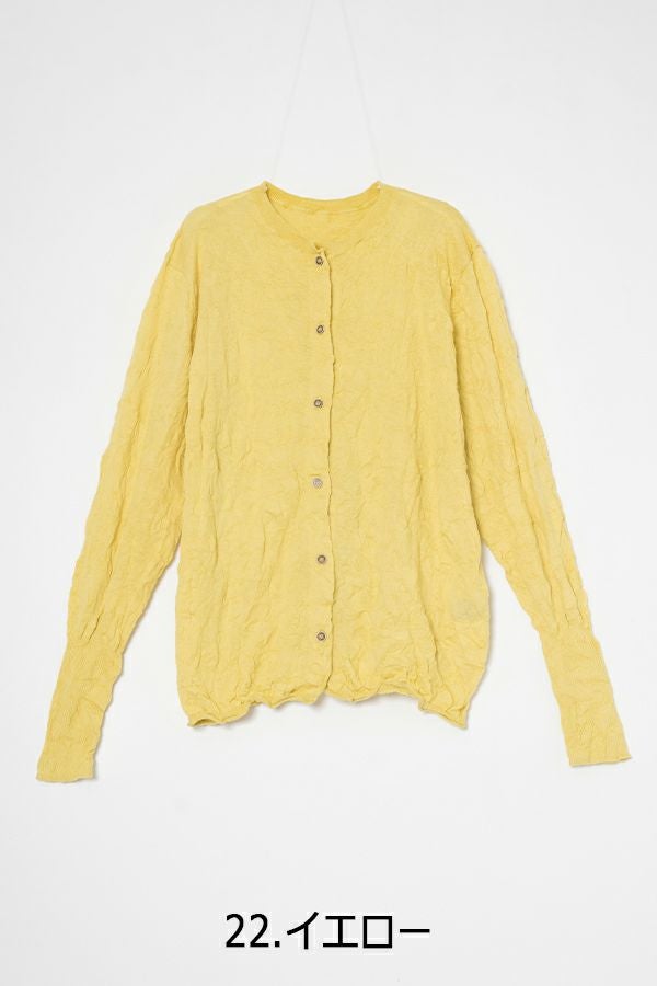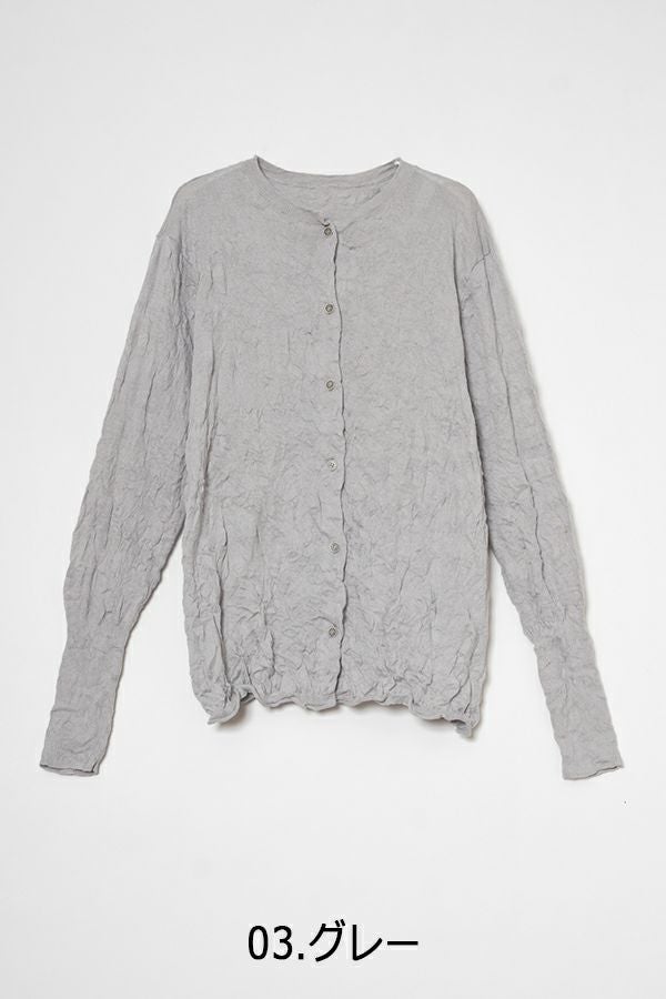 チクチクする素材が苦手な方に好評のロングヒットのカーディガンです。 肌に優しい天然繊維の綿素材との混紡素材で 職人の絶妙な加減で作られているシワ加工製品は、1枚1枚のシワの出方が違う希少価値の高い製品です。 ランダムに入るシワによって体型が出にくい外観にもなっています。 伸びも良く、何度も着たい、優しい肌触りで色々なアイテムの着合わせに最適です。