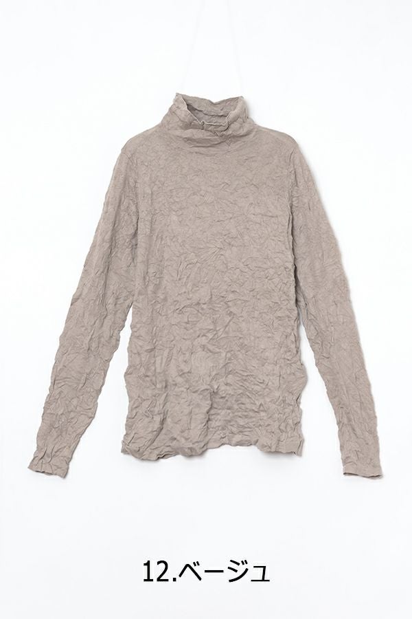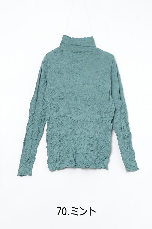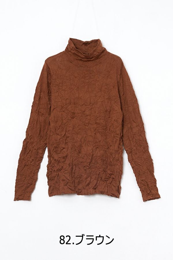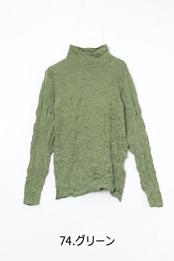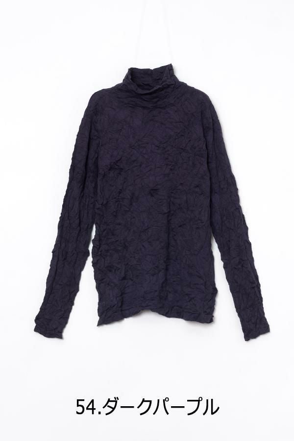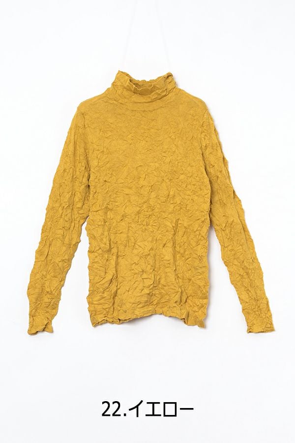 チクチクするの素材はイヤ!とおっしゃるお客様に、大変喜んで頂いている名品カットソー。この秋は、12色展開で登場! 肌触りの良い綿ポリエステルの素材で、真夏以外年中着用可能な素材です。お色違いで買い揃えても後悔しません。 職人の絶妙な加減で作られているシワ加工製品は一枚一枚のシワの出方が違う希少価値の高い製品です。 ランダムに入るシワによって体型が出にくい外観にもなっています。伸びも良く何度も着たい優しい肌触りです。衿の高さは、高すぎず低すぎない実用かつ、オシャレに着こなせる衿元を実現。色々なアイテムの着合わせに最適です。 綿とポリエステルの混紡素材で、ソフトな肌触り。シワ加工に必ず必要なポリエステルは、ポリステルの特徴である熱に強く一度熱で変形させると元に戻らない性質を利用。 肌に優しい天然繊維の綿素材との混紡素材で市場では少ないシワ加工のセーターを作りました。