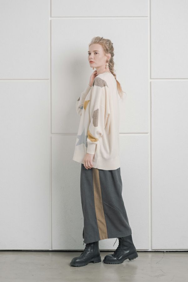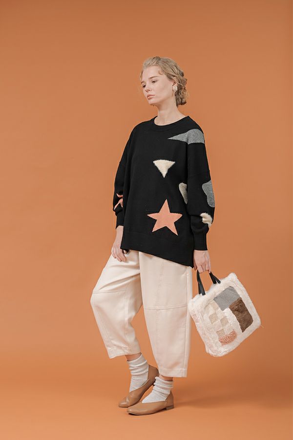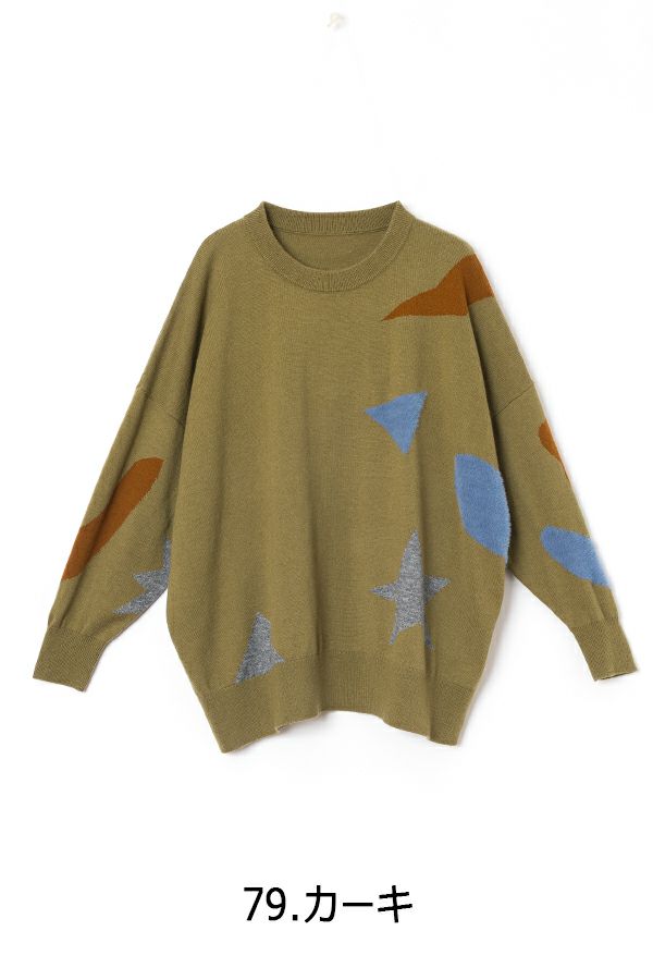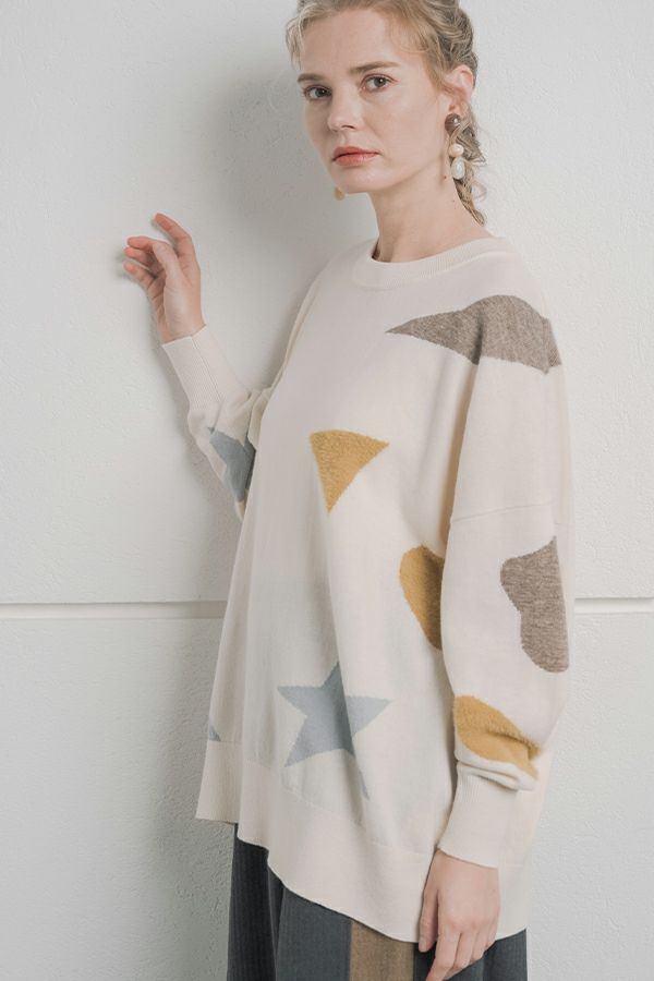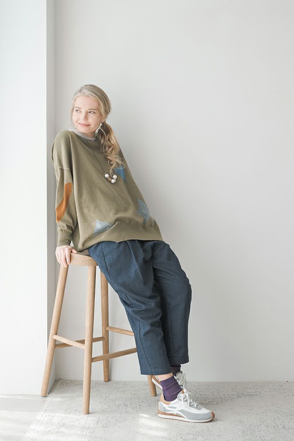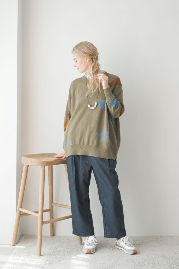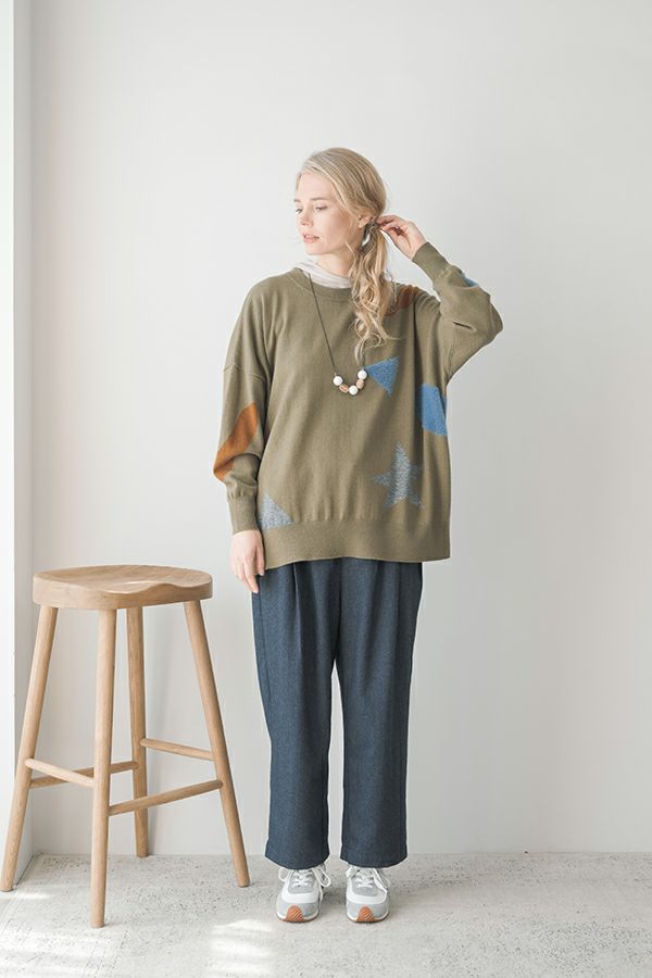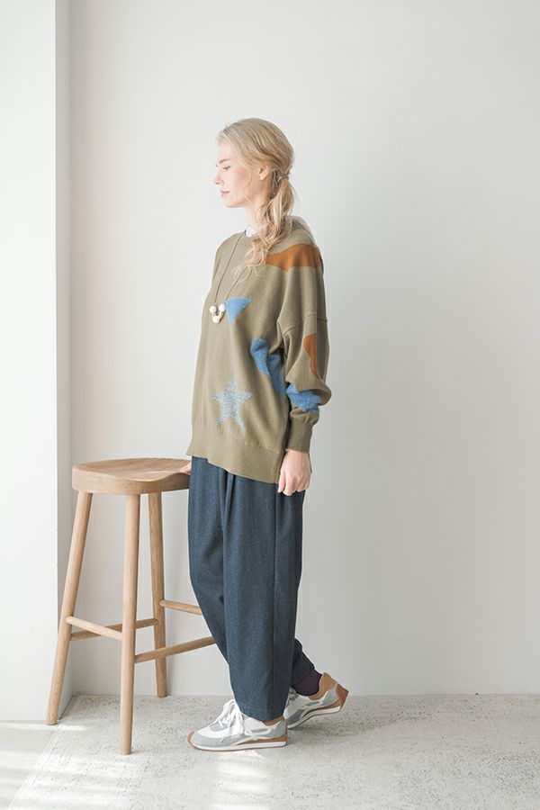 毛混30%の柔らかい肌触りが気持ち良い、インターシャプルオーバー。 身頃の柄は職人が3種類4色の糸を使って、手間暇かけて作っています。 ゆったりとしたサイズで薄手で暖かいアイテム。 星柄がキュートで遊び感覚で着たい一枚です。