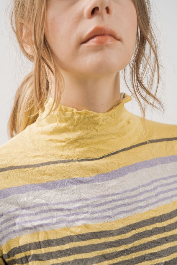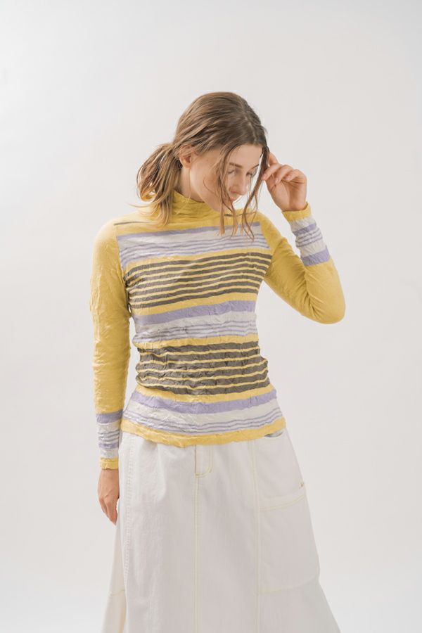 毎年定評のあるシワ加工シリーズからレイヤードが楽しくなる、シワボーダープルオーバーが登場。 高さは、高すぎず低すぎない実用かつ、オシャレに着こなせる衿元を実現。色々なアイテムの着合わせに最適です。綿とポリエステルの混紡素材で、ソフトな肌触り。 シワ加工に必ず必要なポリエステルは、ポリステルの特徴である熱に強く一度熱で変形させると元に戻らない性質を利用。ポリステルの混率が高いほどシワ加工のセット性も高くなります。今回ポリエステルの特性を生かして肌に優しい天然繊維の綿素材との混紡素材で市場では少ないシワ加工のセーターを作りました。