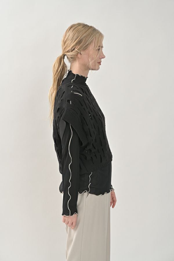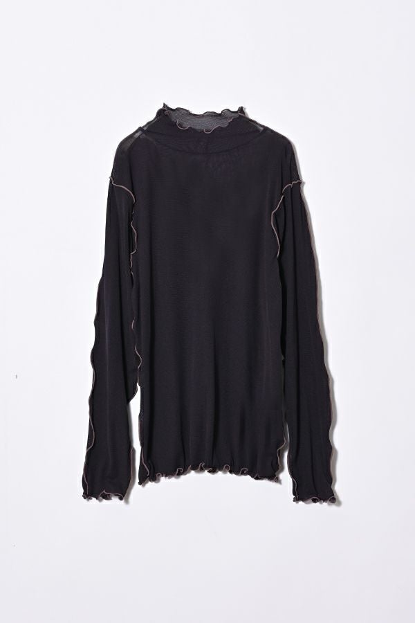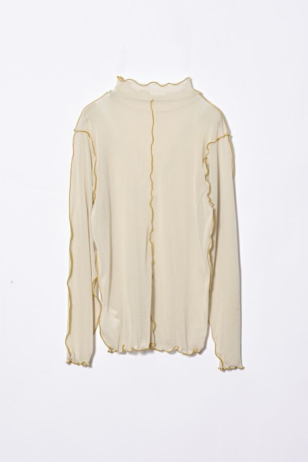 シンプルなデザインが魅力のシアーハイネックプルオーバー。 コンパクトなシルエットと後ろに入ったスリットで大人の抜け感を演出。ソフトで優しい風合いのメッシュ素材を使用し、配色のメロウステッチがシンプルな中にモード感漂うデザインアクセントになっています。 通常のインナーメッシュタイプより 身頃を少しゆったりめのシルエットにすることで、よりカットソーブラウスとして着用しやすい一枚です。 キレイめなジャケット合わせはもちろん、カジュアルなスウェットやロンTEEのインナーに使ったり、メンズライクなシャツのインナーに合わせて華やかさを出すスタイリングもおススメです。